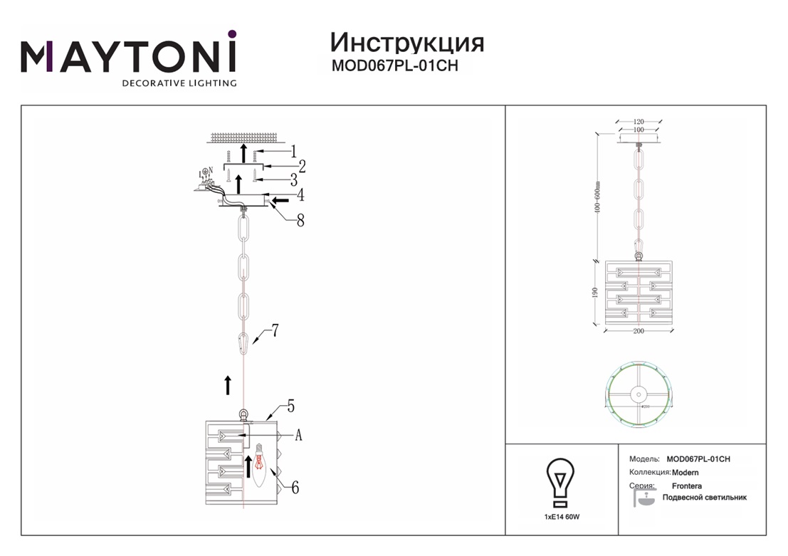 Подвесной светильник Maytoni Frontera MOD067PL-01CH — это надёжный и долговечный осветительный прибор, который станет прекрасным дополнением вашего дома и будет радовать вас своим стильным дизайном и функциональностью на протяжении многих лет.