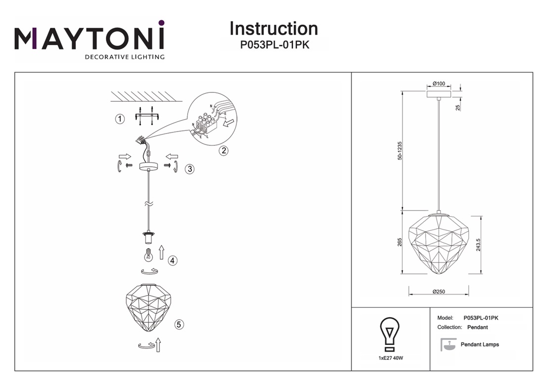 Подвесной светильник Maytoni Globo P053PL-01PK — это модель, в которой сочетаются идеально четкие прямые линии и необычная форма. Благодаря источнику света с типом цоколя E27 и мощностью 40 Вт, этот осветительный прибор обеспечивает комфортное и равномерное освещение на площади в 2 квадратных метра, создавая уютную атмосферу в вашем доме. Арматура светильника изготовлена из металла в цвете хром, а плафон из стекла в розовом цвете с необычной огранкой на поверхности, от чего многочисленные отражения света зачаровывают днем и еще больше ночью, при включенном освещении. Цветовые решения коллекции представлены в голубом, розовом и сером цвете. Размеры устройства составляют 250 мм х 1500 мм, что позволяет легко интегрировать его в любое интерьерное пространство. Технической особенностью является регулировка по высоте в диапазоне от 290 мм до 1500 мм. Серия представлена подвесами различных форм и цветов, которые идеально подойдут для размещения в зоне гостиной, спальни, кабинета, кухни или офиса, оформленных в современном стиле, позволяя использовать в тандеме подвесные светильники, располагая их на разной высоте. Гарантия на товар составляет 2 года. Подвесной светильник Maytoni Globo P053PL-01PK — это надёжный и долговечный осветительный прибор, который станет прекрасным дополнением вашего дома и будет радовать вас своим стильным дизайном и функциональностью на протяжении многих лет.