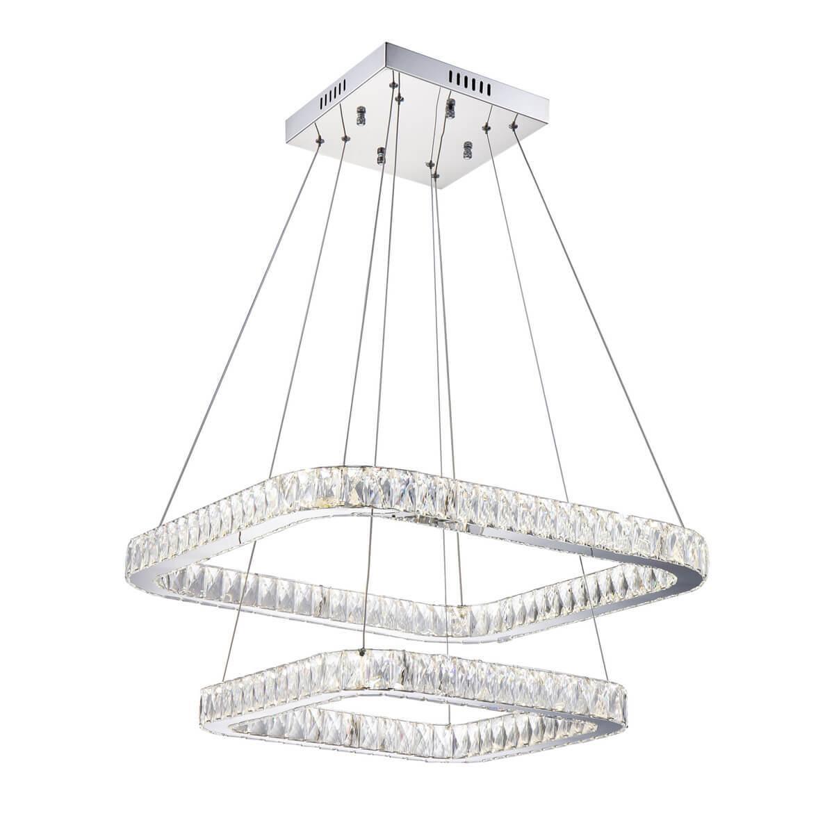 Корпус светильника металлический с глянцевым хромированным покрытием. Два хрустальных кольца квадратной формы, высоту и угол наклона каждого из которых можно легко изменить, подвешены на утончённых стальных тросиках. Размер светильника 70х70см, высота 25-160см. Источником света являются встроенные светодиоды мощностью 140Вт, свет безопасный для глаз, без мерцания и пульсаций.