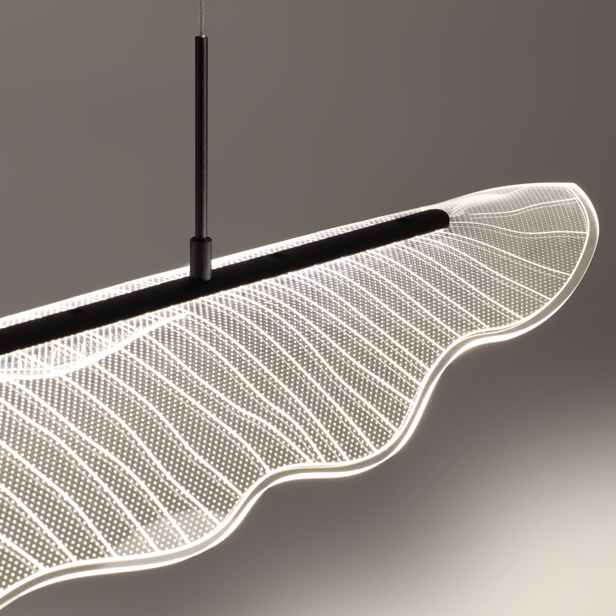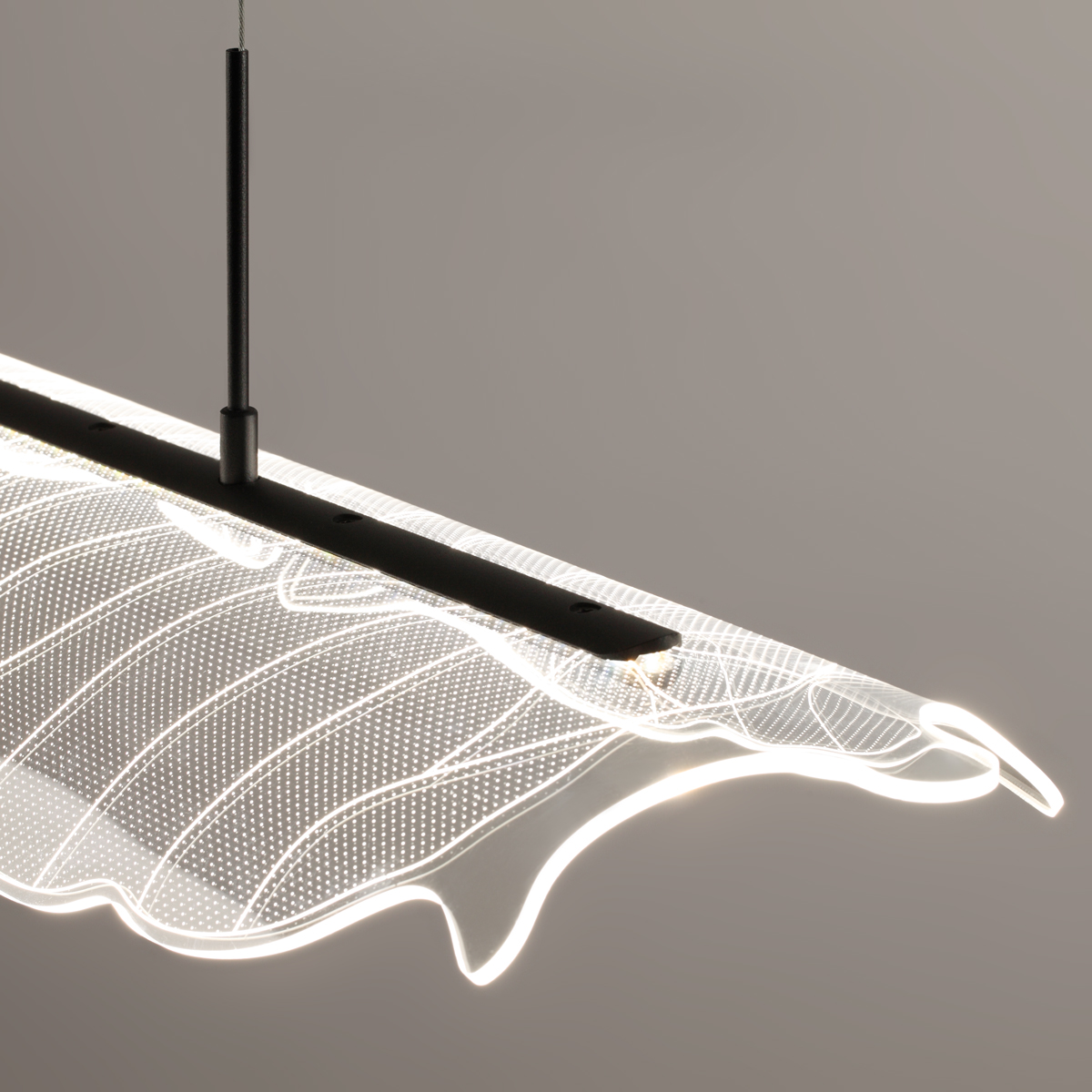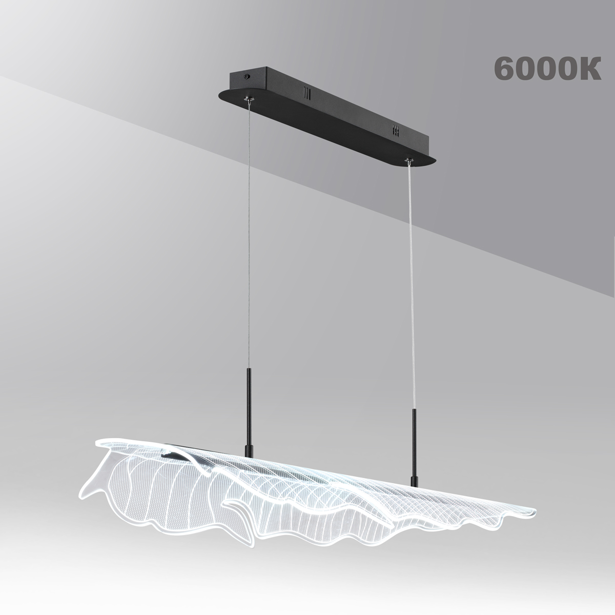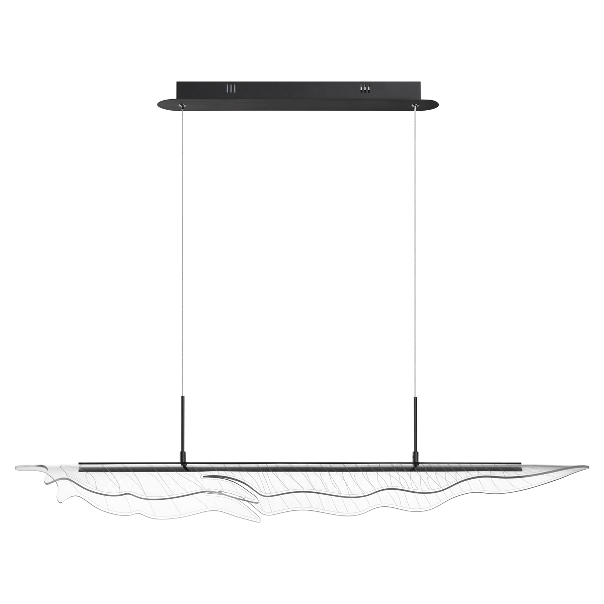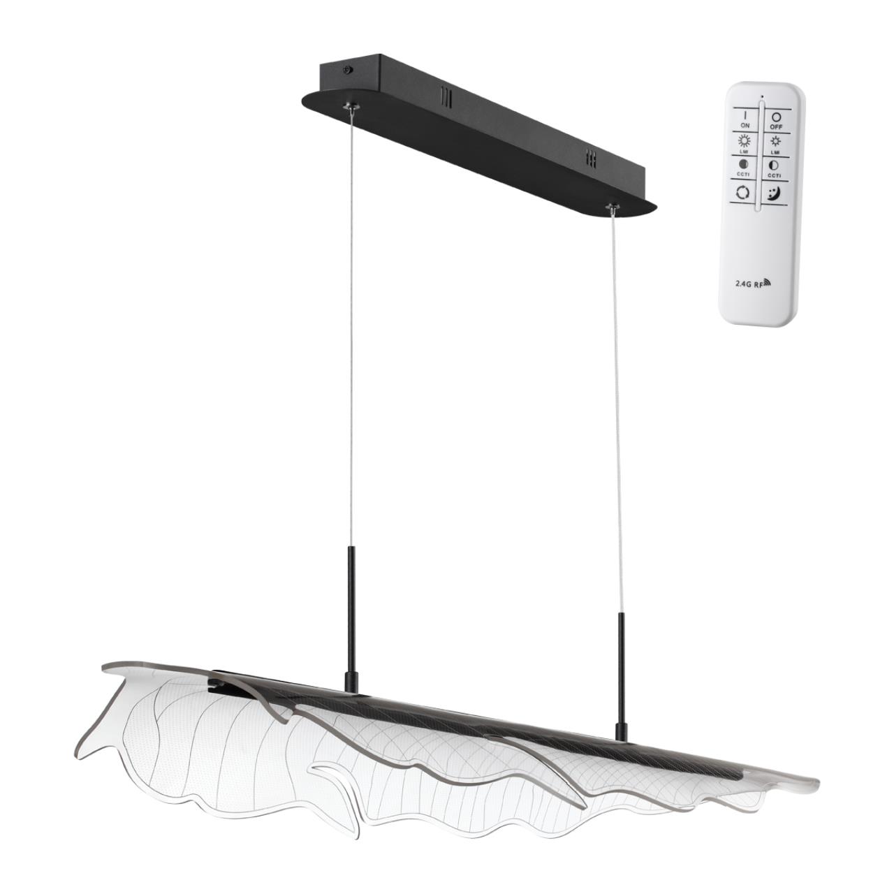 Подвесной светодиодный светильник с пультом ДУ Novotech FOGLIO 359323 — это модель, в которой каждая деталь подчеркивает стиль и функциональность. Конструкция светильника представляет собой подвес длиной 98,5 см с черной металлической арматурой и с плафоном из акрила в виде прозрачного фактурного листа с волнистыми краями, словно только что упавшего с ветки дерева. Тип подвеса - трос. Благодаря источнику света с типом цоколя LED и мощностью 36 Вт, этот осветительный прибор обеспечивает комфортное и равномерное освещение на площади в 17,5 квадратных метров, создавая уютную атмосферу в вашем доме. Размеры устройства составляют 985 мм х 220 мм х 1200 мм, что позволяет легко интегрировать его в любое интерьерное пространство. Технической особенностью является регулировка по высоте, что дает возможность, изменяя длину шнура, создавать эффектные инсталляции, располагая подвесной светильник на нужной вам высоте. Также в комплекте идет пульт дистанционного управления, с помощью которого вы можете регулировать цветовую температуру между тёплым 3000К для вечернего отдыха и холодным 6000К для концентрации во время домашних дел, изменять яркость света (диммирование от мягкого свечения до максимальной мощности 36W), а также осуществлять включение/выключение без необходимости подходить к выключателю. Гарантия от венгерского производителя составляет 2 года. Способ крепления светильника к потолку на планку позволяет быстро и просто осуществить монтаж, при этом подходит для всех типов потолков, в том числе и натяжных. Данная модель, входящая в коллекцию FOGLIO, имеет угол рассеивания света 360°, что создаёт равномерное освещение на всей площади, и идеально подойдет для размещения в зоне гостиной, спальни, ресторана или офиса, оформленных в стиле Хай-тек, а также над кухонным островом или обеденным столом, превращая пространство в уютное или рабочее — в зависимости от ваших потребностей. Стильный дизайн, тип подвеса на трос и регулировка цветовой температуры делают подвесной светодиодный светильник с пультом ДУ Novotech FOGLIO 359323 особенным элементом декора, который украсит любое интерьерное пространство. Ведь это не просто осветительный прибор, а многофункциональный элемент интерьера, который подстраивается под ваши ритмы жизни. Данную модель 359323 с быстрой доставкой спешите купить в магазине 220svet.ru