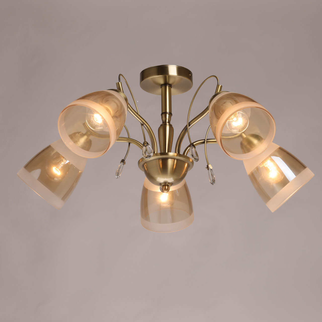 Потолочная люстра 315016105 на 5 стекляных плафонов золотистого цвета и арматурой металл бронзового цвета , от производителя De City . Плафоны с цоколем Е14 и мощностью 40W площадь освещения 10 кв. м. Данную модель всегда можете купить в интернет-магазине 220svet.