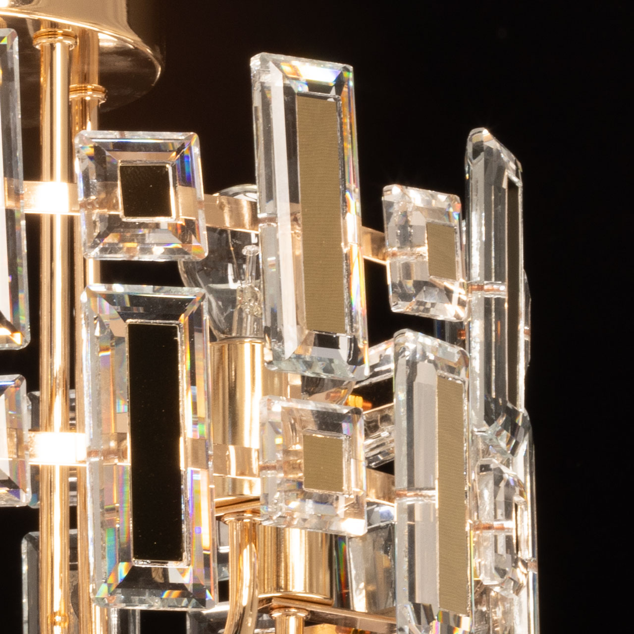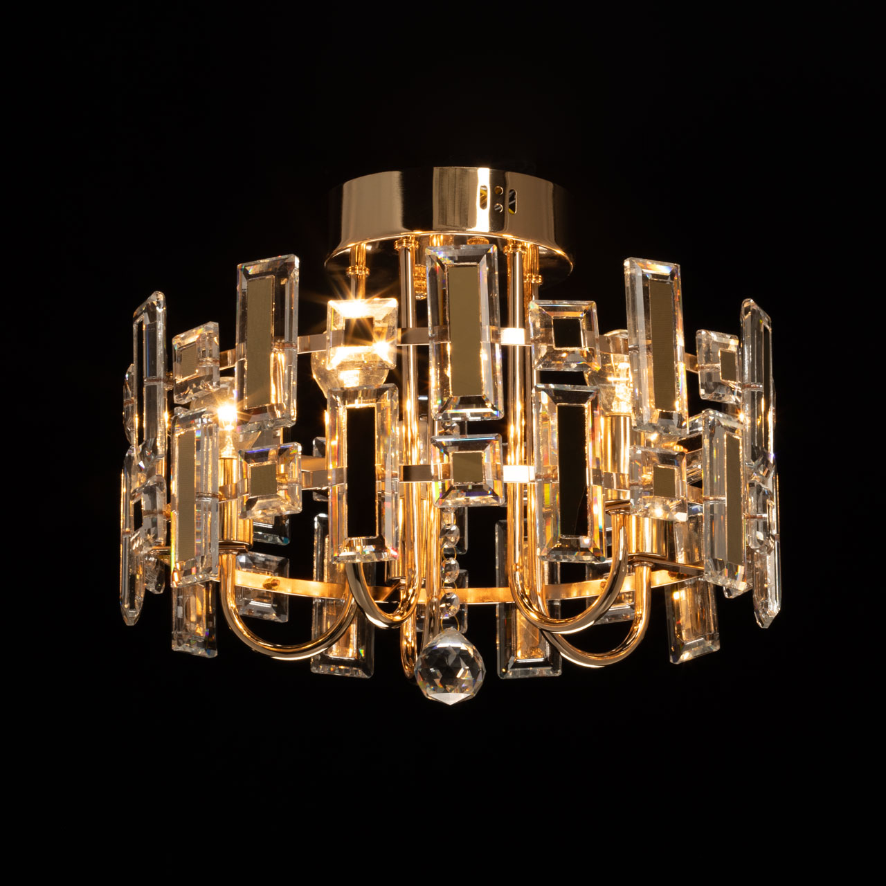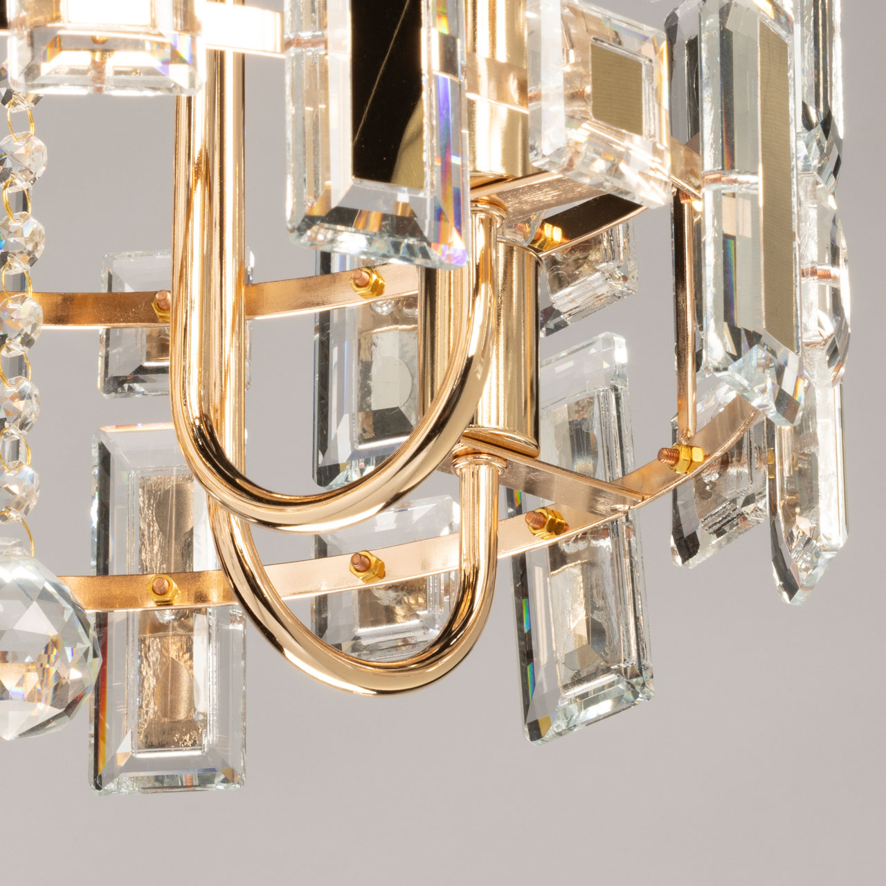 Металлическое основание потолочной люстры гальванизировано в цвет золота. Люстра декорирована прозрачным хрусталем прямоугольной формы и формы шара. Хрустальные элементы разного размера дополнительно декорированы металлическими пластинами, гальванизированными в цвет основания.