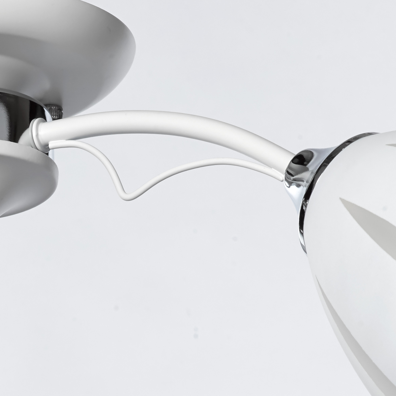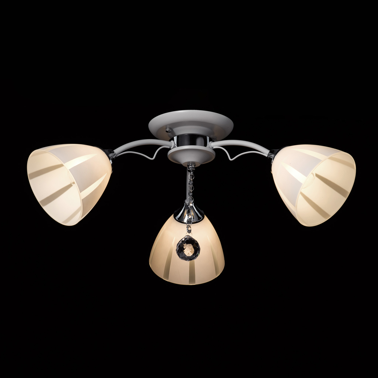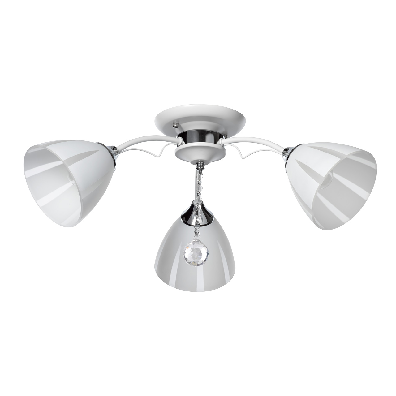 Стильная модель имеет простую конструкцию. Металлическое основание окрашено в белый цвет и дополнено слегка изогнутыми рожками, направляющими плафоны под углом в 45 градусов. 3 стеклянных плафона декорированы белой краской по трафарету, который создает эффект объемной, текстурной формы. Хрустальный шар по центру композиции добавляет шарма и изящности.