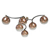 Металлическое основание потолочного светильника окрашено в черный цвет. Отдельные элементы гальванизированы в цвет бронзы. Стеклянные плафоны выдувные в форму градиентно гальванизированы в цвет меди. Градиент уменьшается от основания плафона в его краю.