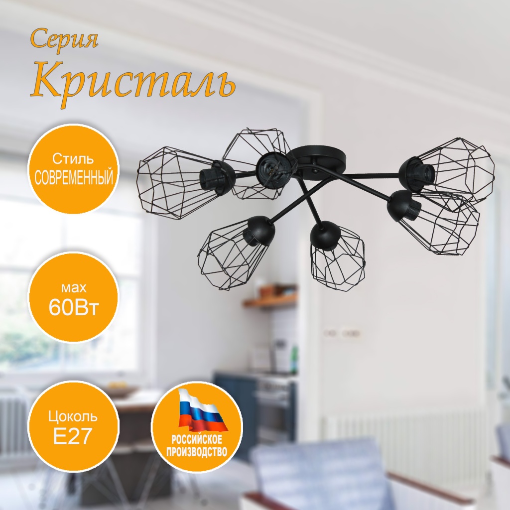 Светильник из серии "Кристаль" уникальной конструкции, он оригинален своей формой, в этом его отличительная особенность. Способ крепления светильника на планку позволяет легко монтировать его на потолок, даже в случае устройства натяжного потолка. Источник света - лампы накаливания мощностью до 60 Вт, светодиодные лампы, энергосберегающие лампы. Цоколь лампы Е27. Модель произведена с использованием материалов: металл. Основным цветом товара является черный . Потолочная люстра осветит помещение площадью 20 м2. Светильник в стиле Лофт предусматривает использование популярных филаментных ламп (Ретро-лампа, лампа Эдисона) - это светодиодные лампы, имитирующие стандартную лампу накаливания, в которых вместо нити накаливания размещены светодиодные нити, которые при свечении дают пламенный, теплый, оранжевый мягкий свет. Подобные светодиодные лампы создают уютное освещение с оттенками света от свечи или камина и в тоже время не дают слепящего эффекта. Хотите оригинальный светильник в дом - это ваш выбор. Данную модель 1005405218 можно купить в интернет магазине 220svet.ru