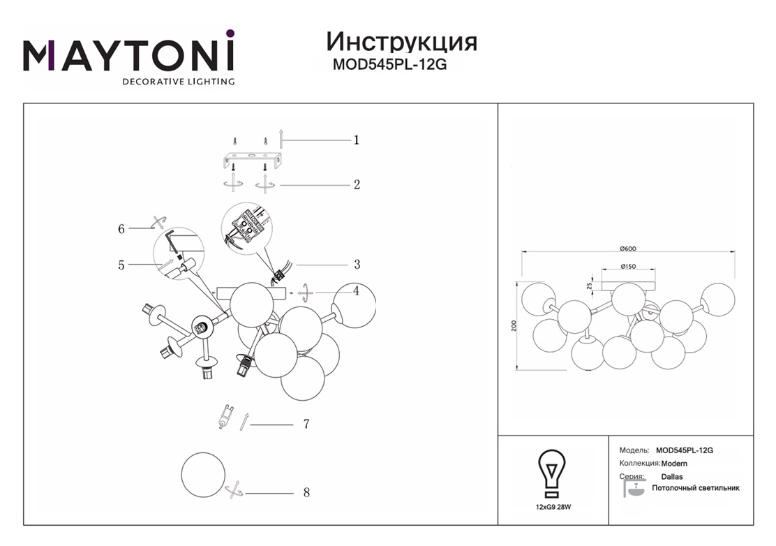 Потолочная люстра Maytoni Dallas MOD545PL-12G — это надёжный и долговечный осветительный прибор, который станет прекрасным дополнением вашего дома и будет радовать вас своим стильным дизайном и функциональностью на протяжении многих лет. Не упустите возможность приобрести данную модель в интернет-магазине 220svet.ru