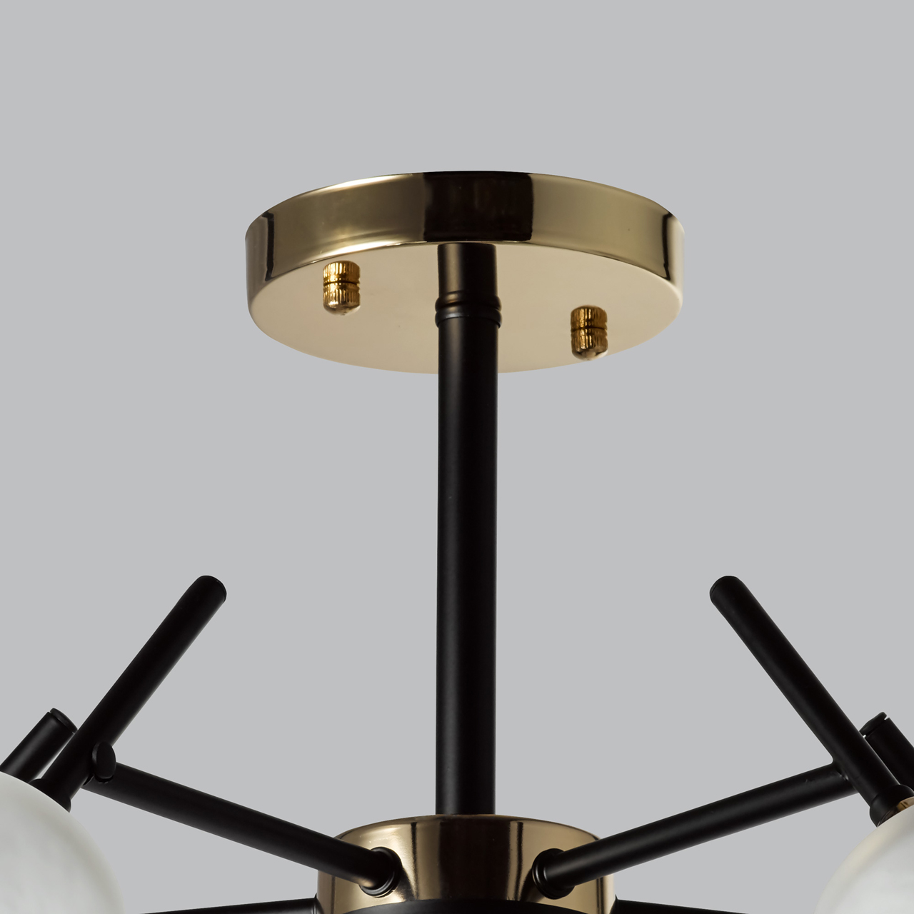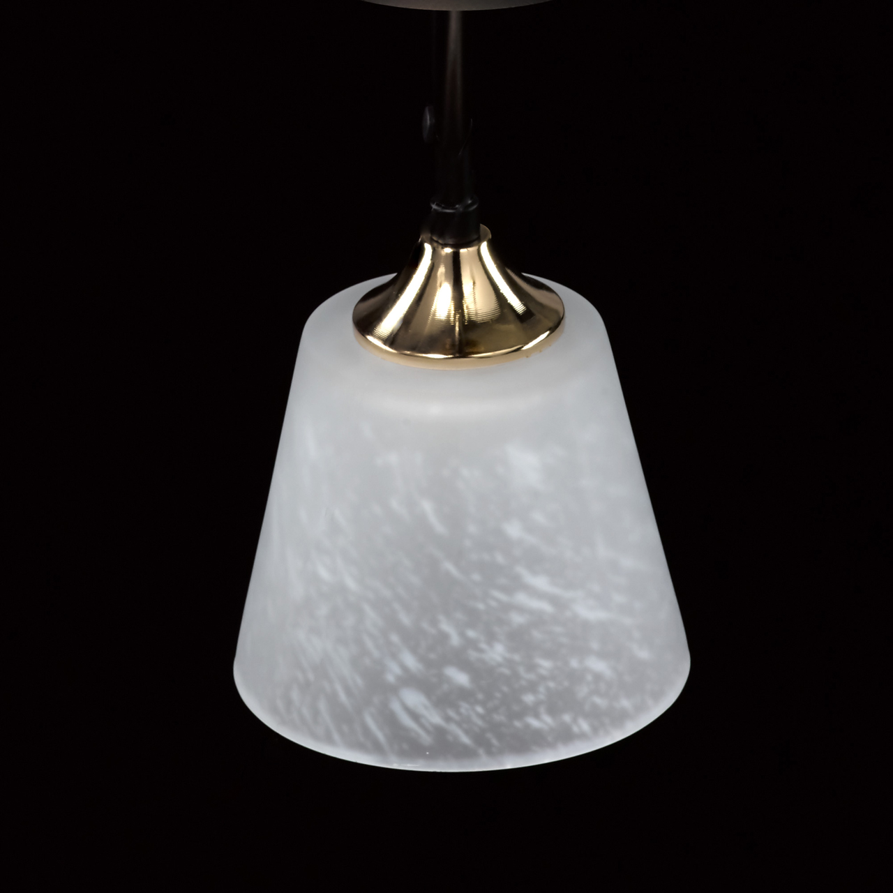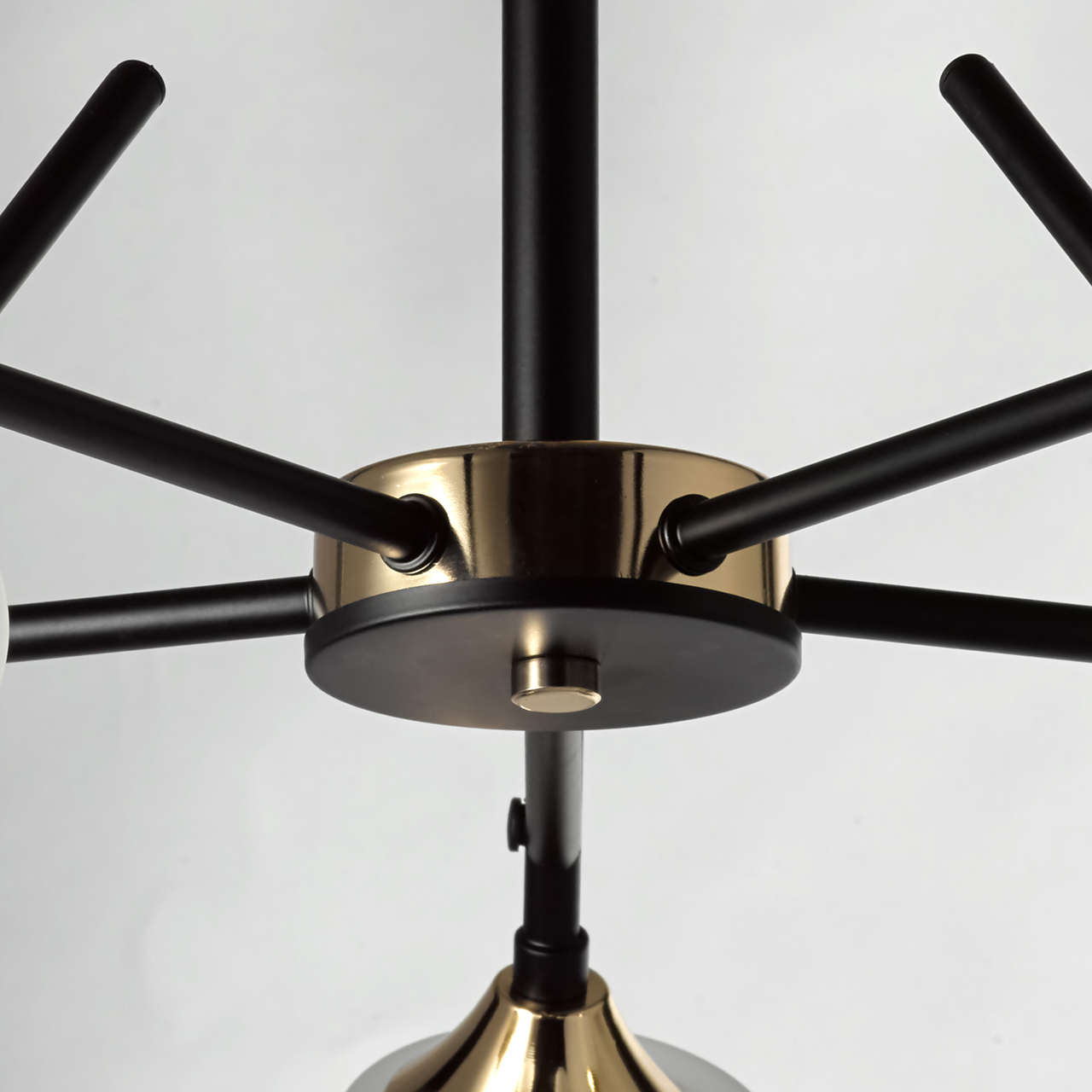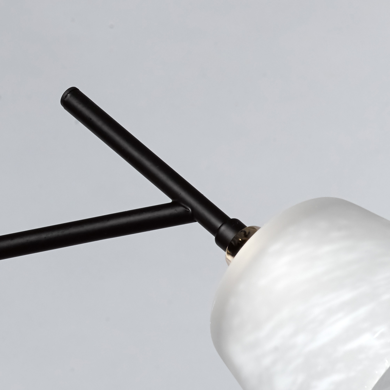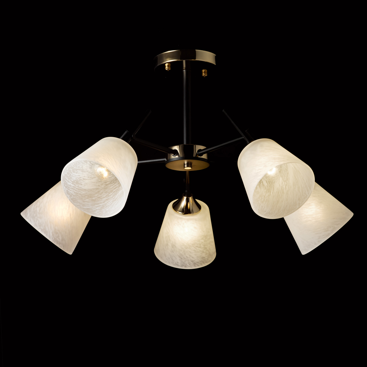 Основание светильника выполнено из металла и окрашено в черный цвет. Отдельные элементы основания гальванизированы в цвет золота. Плафоны выполнены из алебастрового стекла.