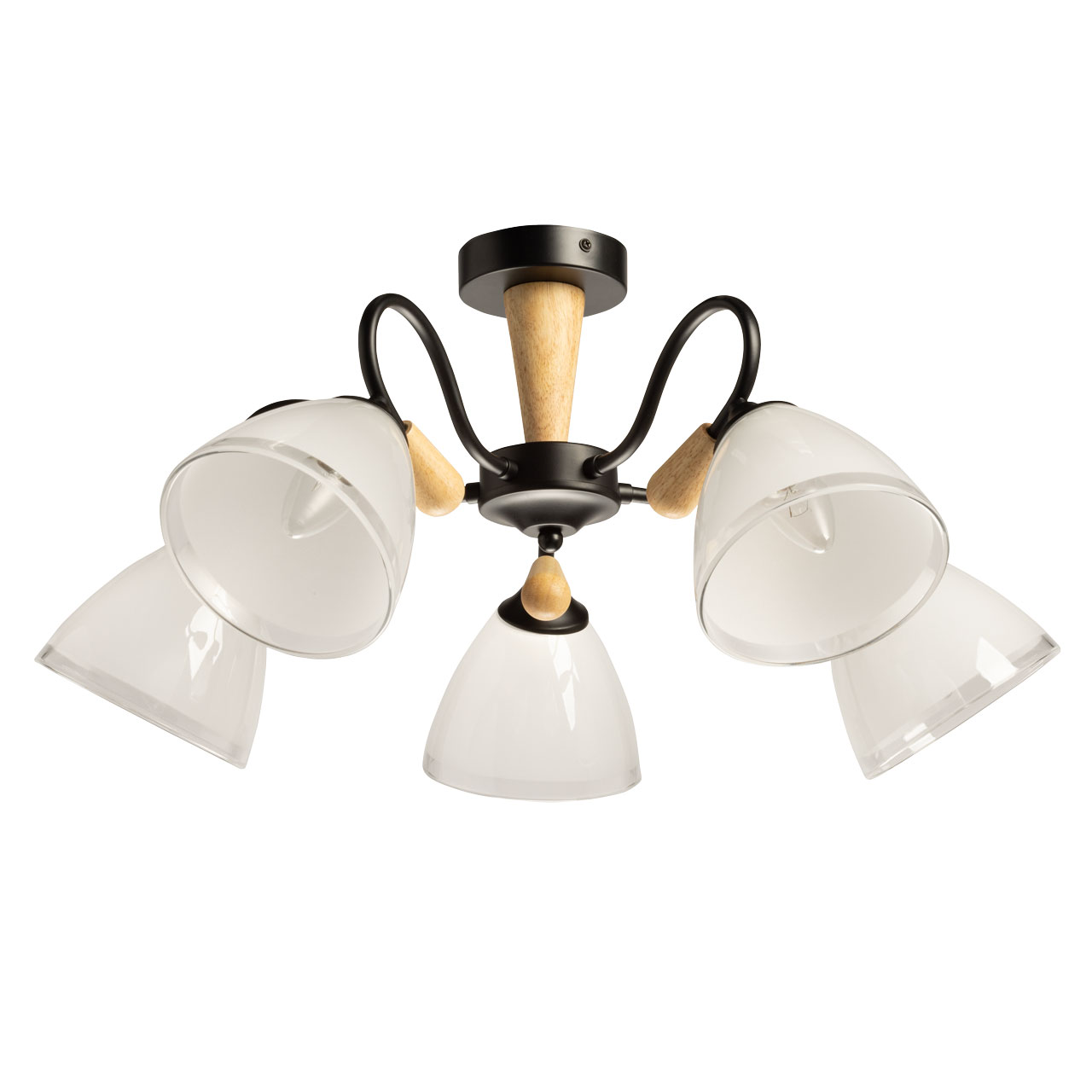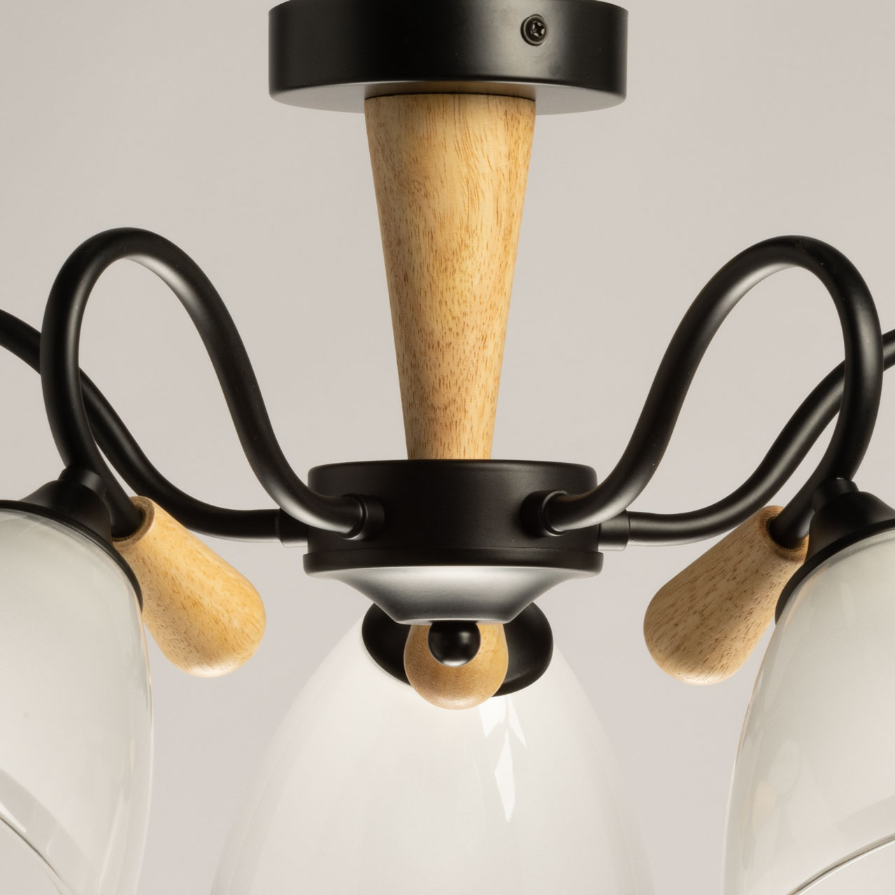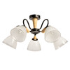 Металлическое основание потолочной люстры окрашено в черный цвет. Отдельные элементы основания выполнены с имитацией под цвет натурального дерева.Стеклянные плафоны отлиты в форму и окрашены в белый цвет изнутри, украшены прозрачным кантом.