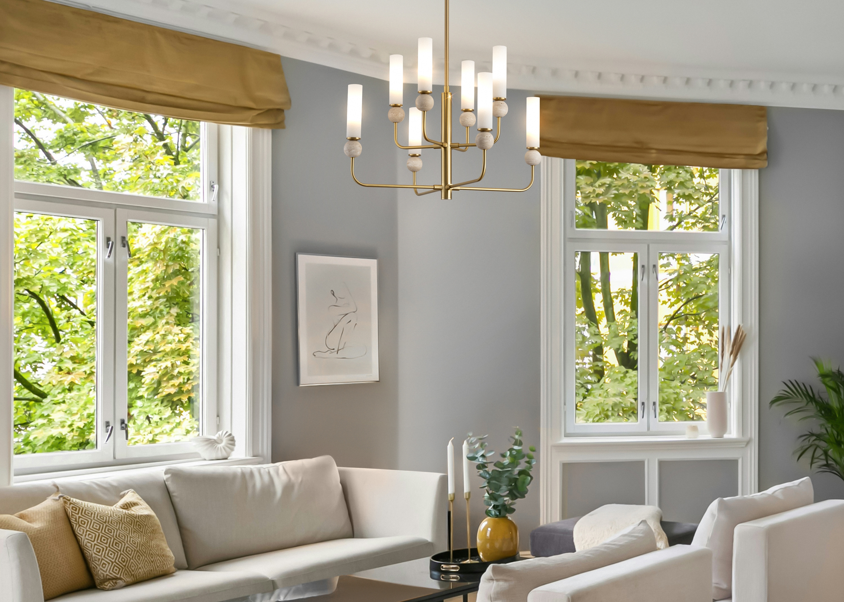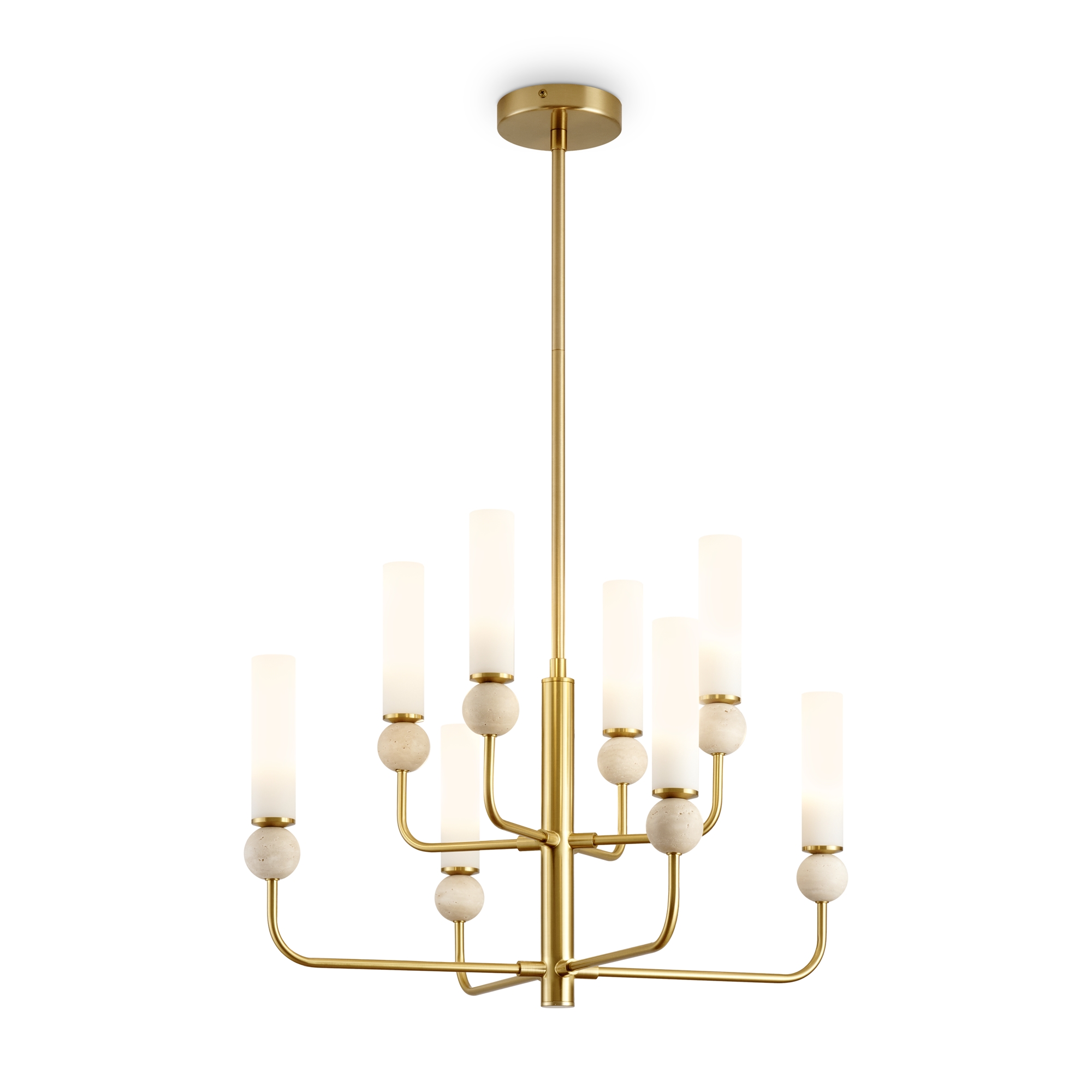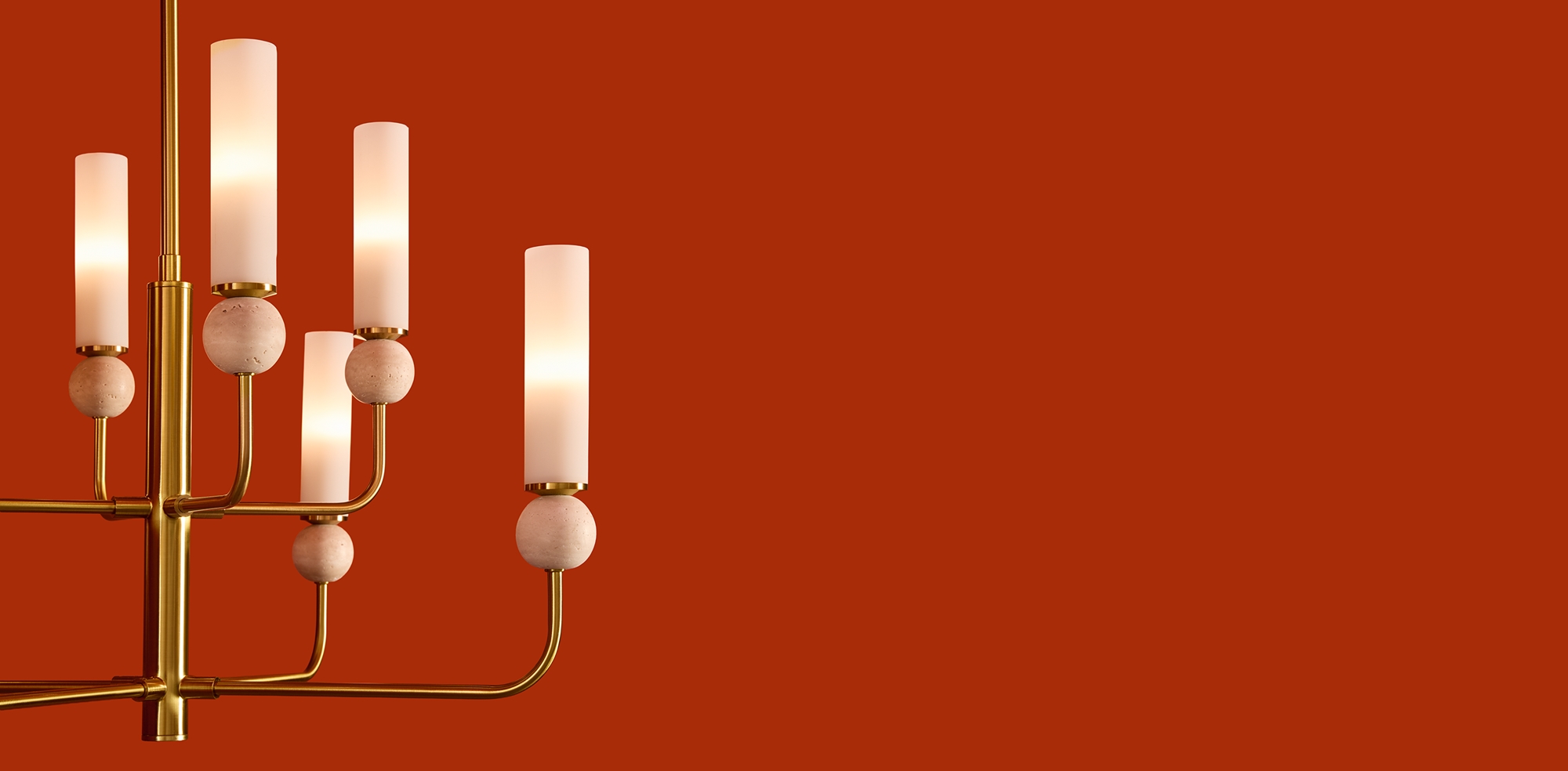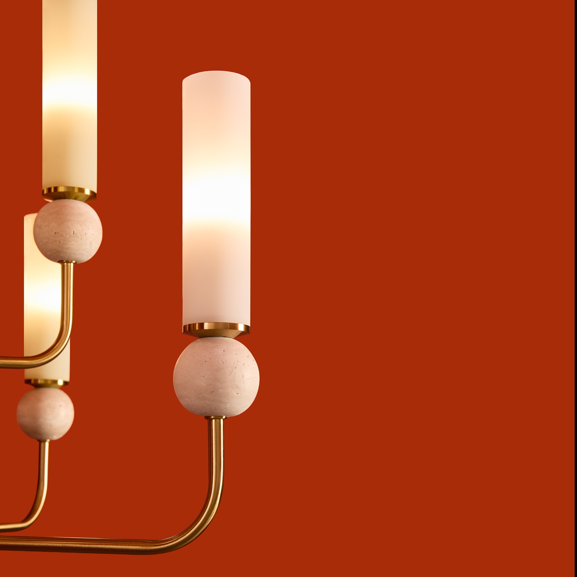Серия Sunspot использует камень травертин как основной декоративный элемент. Настенные бра в двух вариантах: с матовым белым стеклянным плафоном и со «скользящим» теплым светом. Отличительная черта бра: увеличенный размер плафона и сенсорное включение/выключение без диммирования. Подвесные светильники имеют прозрачные стеклянные плафоны с декоративными шариками из камня травертин. Sunspot включают три модели подвесов разных размеров и форм стеклянной окантовки на плафон. Арматура — металл латунного и черного цвета Источники света LED 3000K и цоколь G9. Настольная лампа с touch переключателем . Серия создает комплексное зональное и акцентное освещение, подходящее для создания уютной атмосферы.