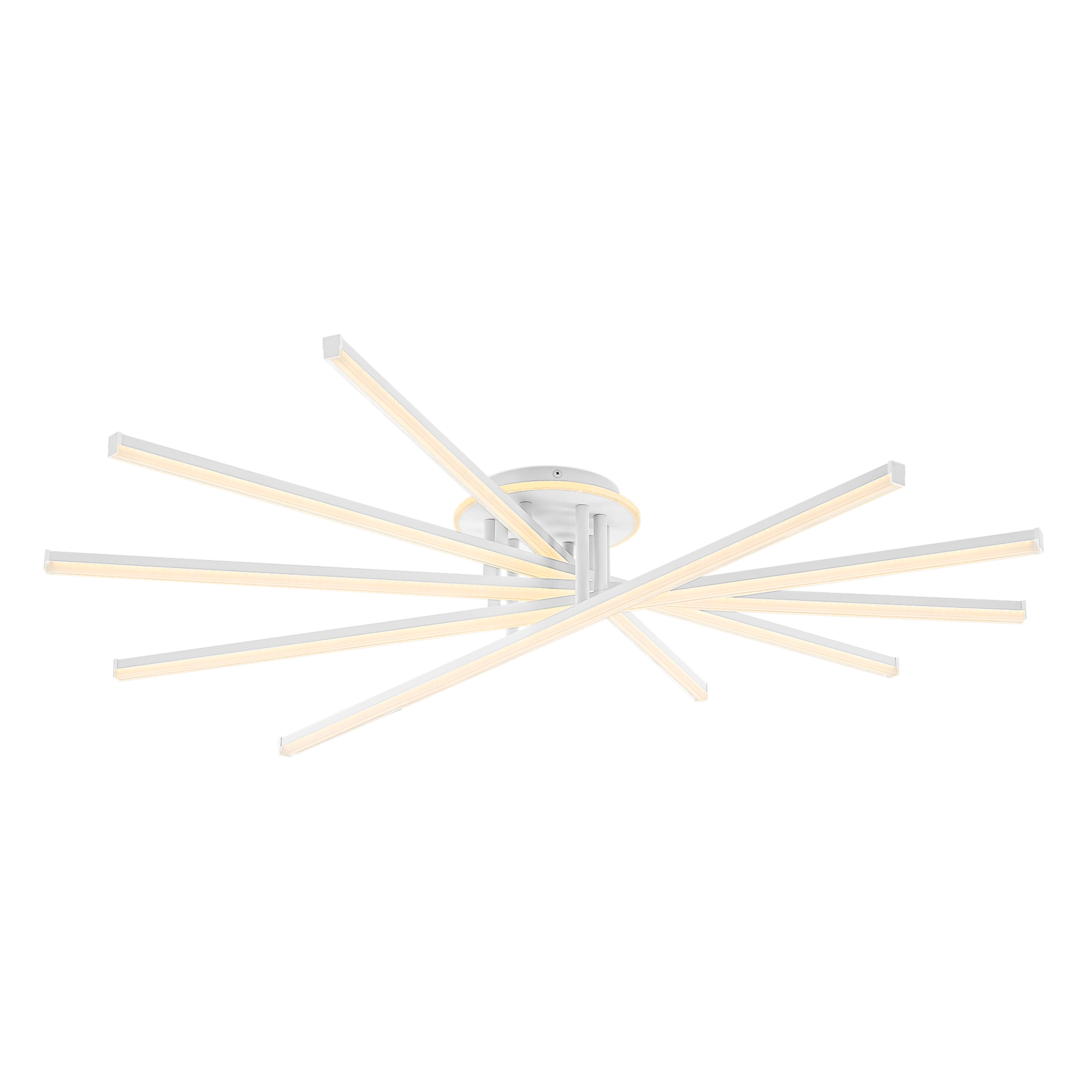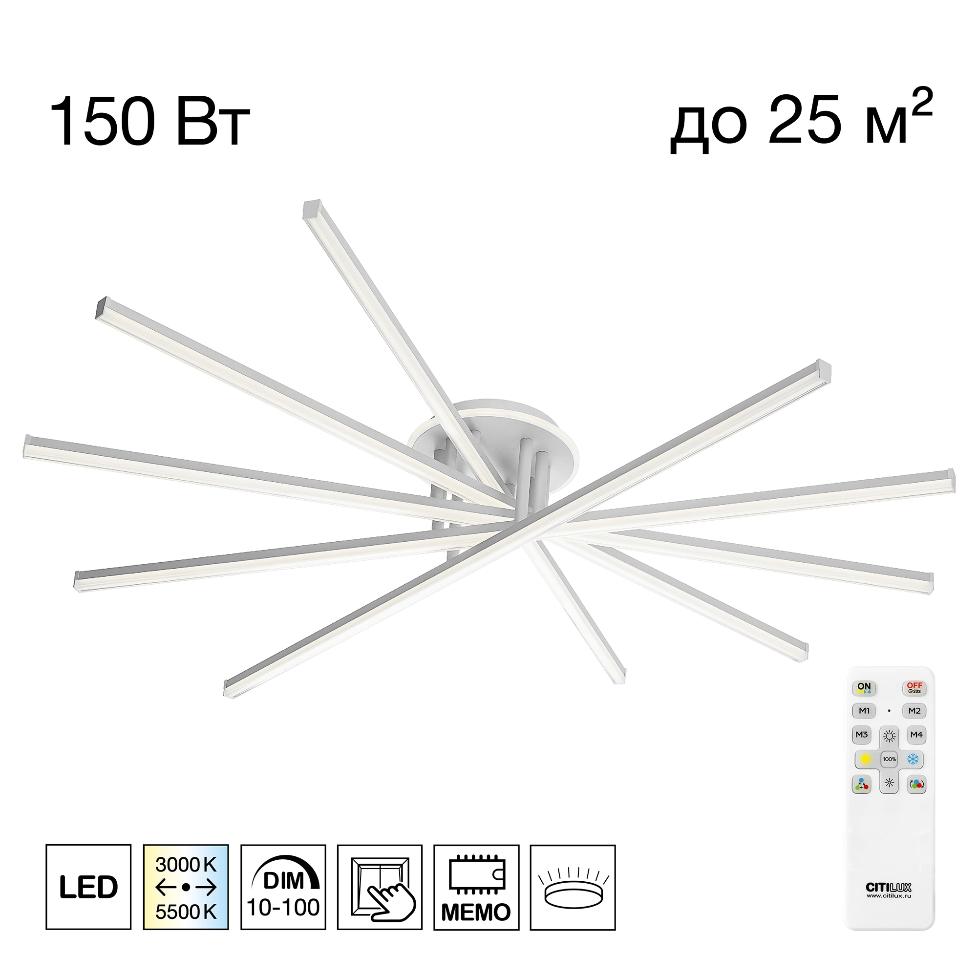 При помощи инфракрасного пульта можно плавно регулировать яркость освещения и цветовую температуру света, настраивая модель так, как вам комфортно. Есть также режим ночника, а также память последнего режима. Можно сохранить любимые режимы освещения (до 4-х штук) и переключать их при помощи простого выключателя на стене. Мощность люстры — 150 Вт, ее можно установить на любой потолок (включая натяжные).