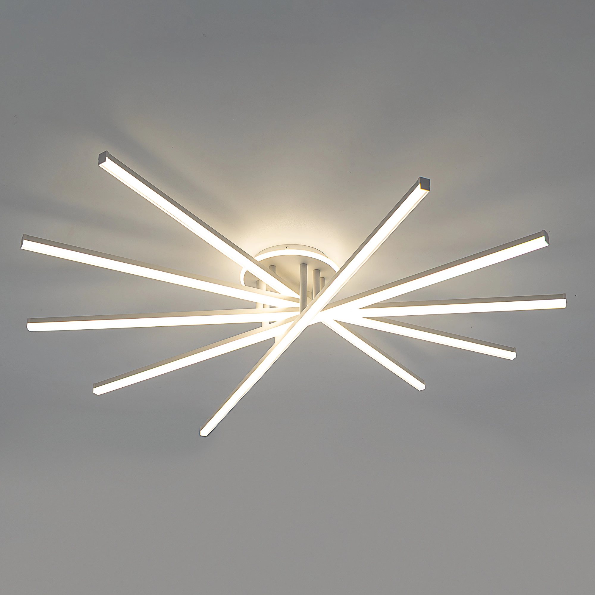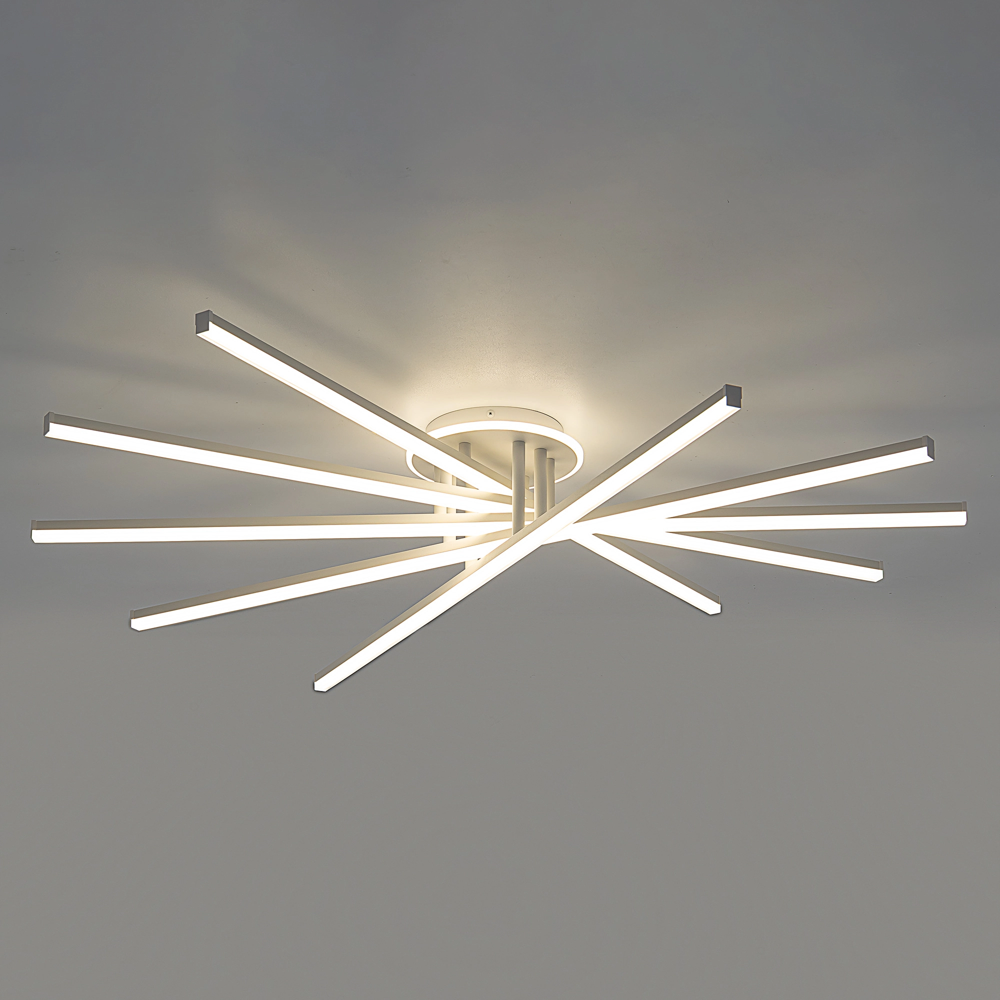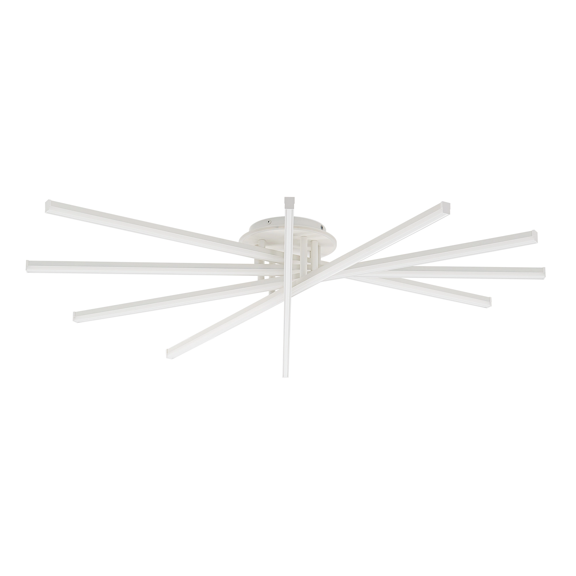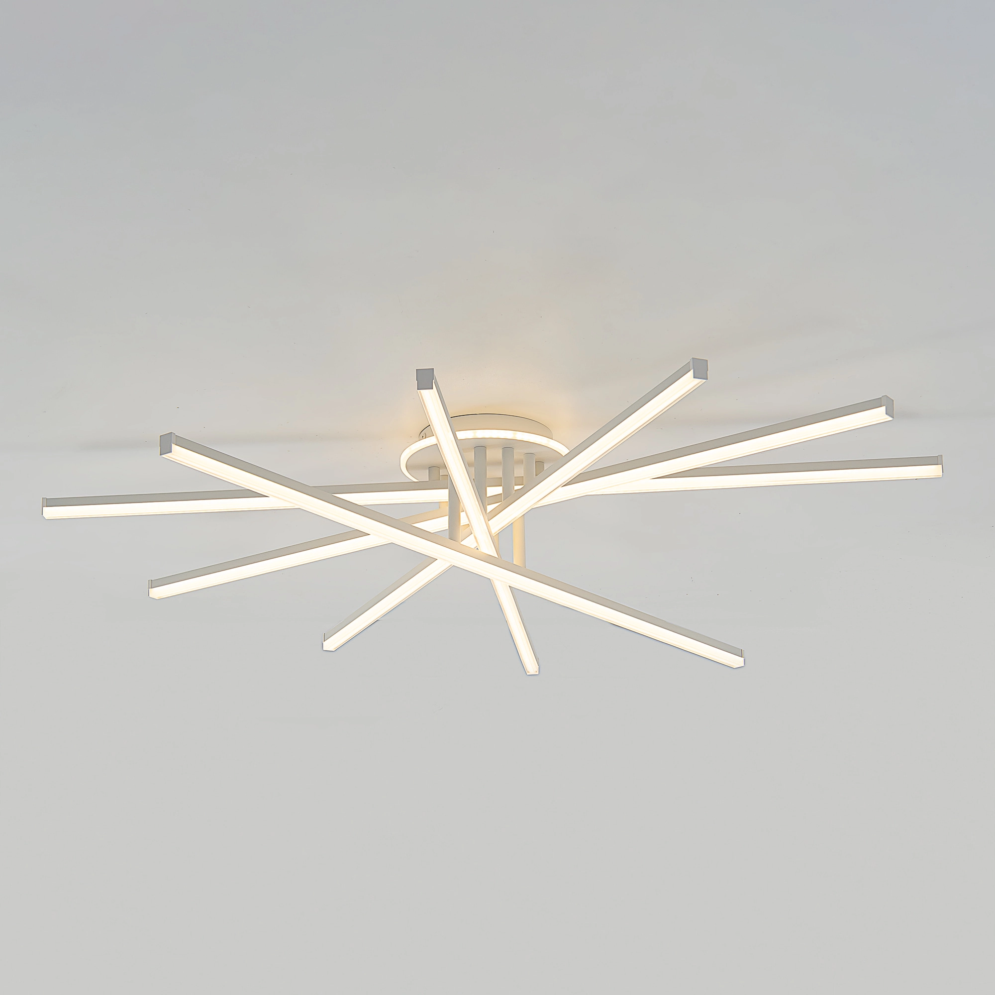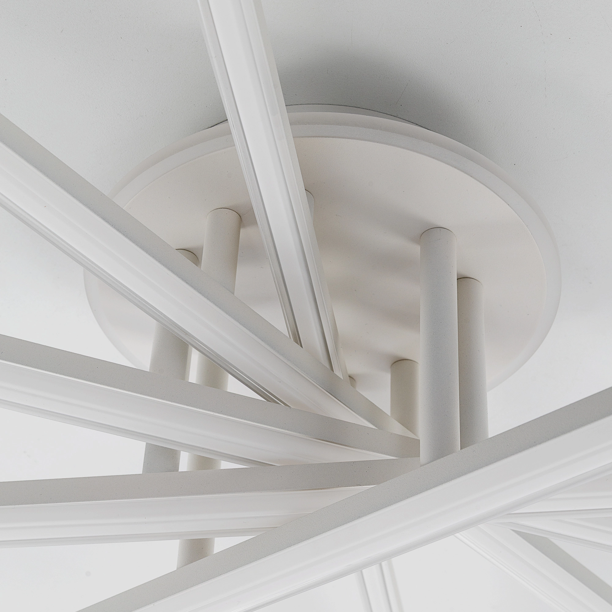 Корпус люстры — из металлического сплава, окрашенного белой краской. Глянцевый рассеиватель — из специализированного оптического полимера. У люстры есть изящная подсветка потолка.