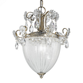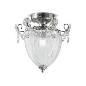 Потолочный светильник серии RUGIADA имеет металлическую основу покрытую фольгированным золотом. Элегантный плафон выполнен из муранского стекла ручной выдувки. Световой элемент один. Светильник декорирован цепочками и подвесками из прозрачного хрусталя.