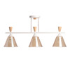 Металлическое основание потолочной люстры окрашено в белый цвет. Стеклянные плафоны отлиты в фактурную форму и гальванизированы в цвет коньяка. Потолочная люстра декорирована элементами из светлого натурального дерева.