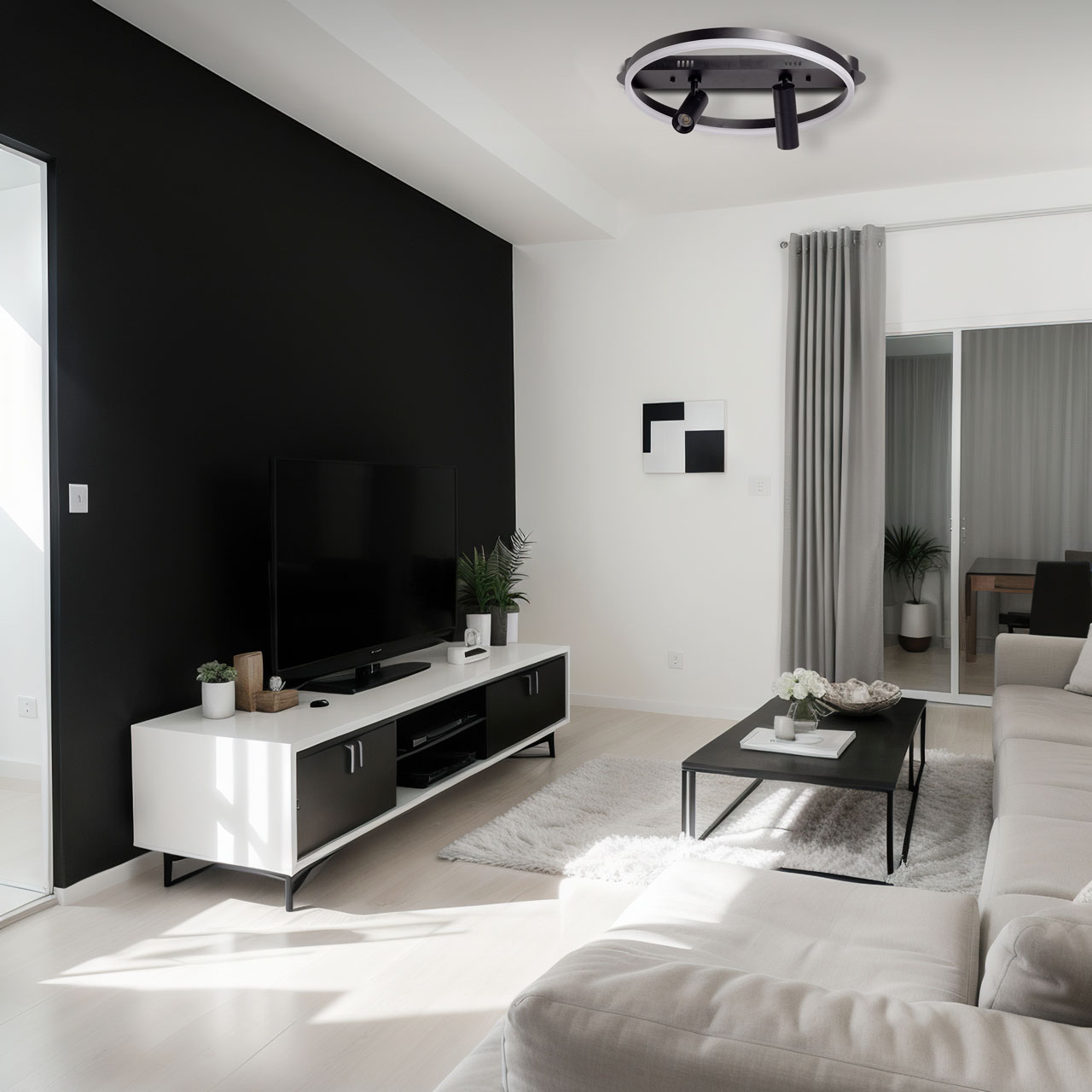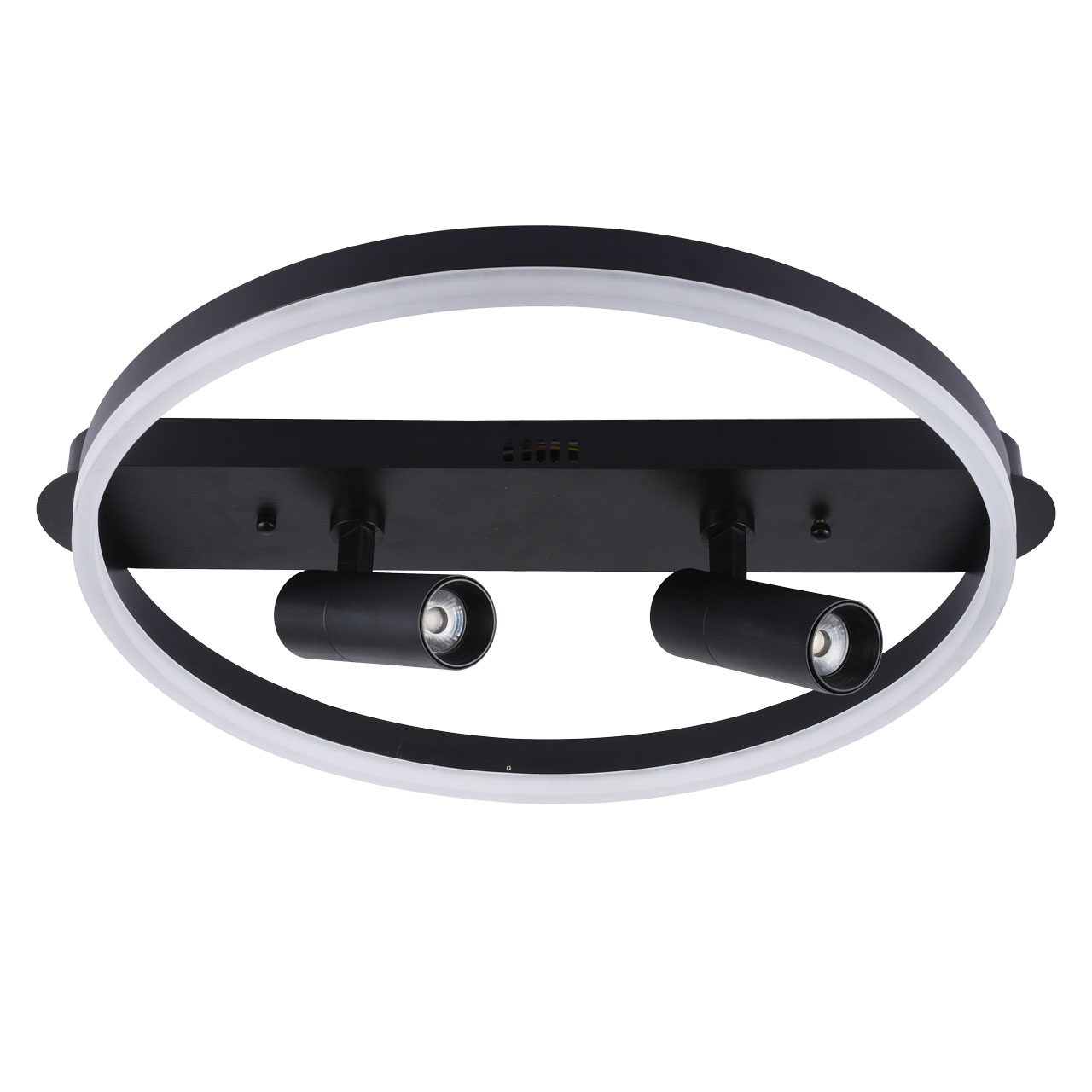 Металлическое основание потолочной люстры окрашено в черный цвет. Корпус плафона выполнен из сплава алюминия и окрашен в цвет основания. Светодиодный источник света закрыт матовым акрилом.
