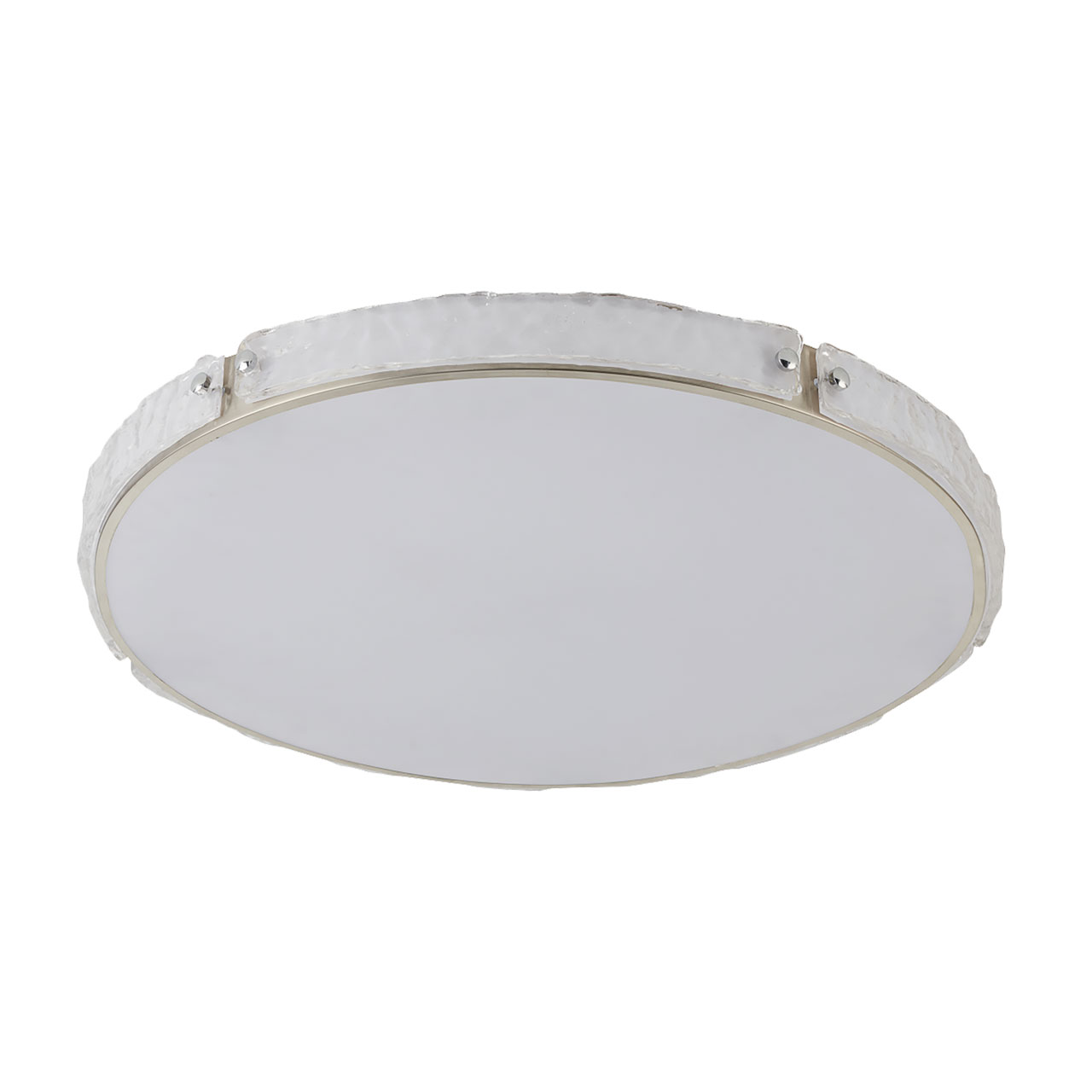 Металлическое основание потолочной люстры гальванизировано в цвет никеля. Светодиодный источник света закрыт белым матовым акрилом. Плафон люстры декорирован прозрачным фактурным стеклом.