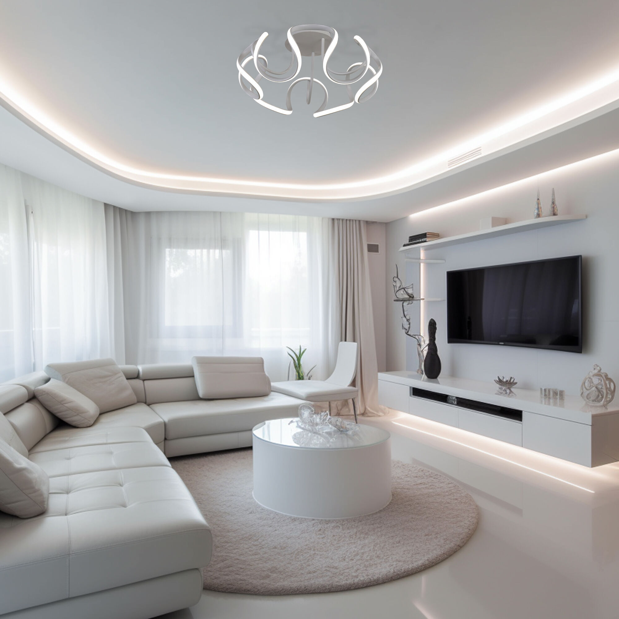 С помощью пульта управления можно изменять яркость и цветовую температуру, доступную в трех значениях: 3300, 4200 и 6500 К. При изготовлении потолочного светильника были использован высококачественный металл. Потолочная светодиодная люстра подходит для установки на любые поверхности, в том числе подходит для натяжных и подвесных потолков.