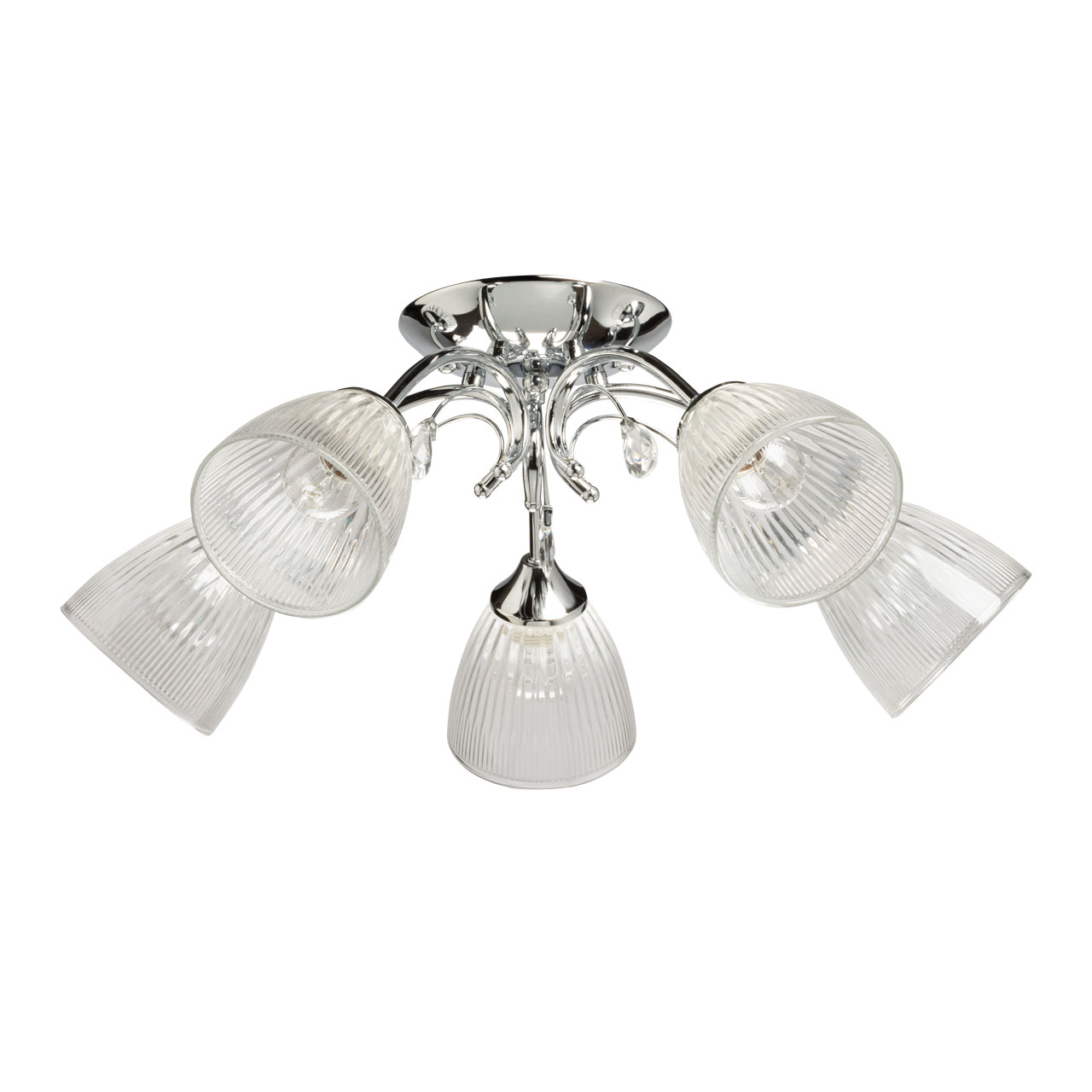 Металлическое основание потолочной люстры гальванизировано в цвет хрома. Прозрачные стеклянные плафоны с линейной фактурой отлиты в форму. Люстра декорирована элементами из прозрачного хрустального стекла.