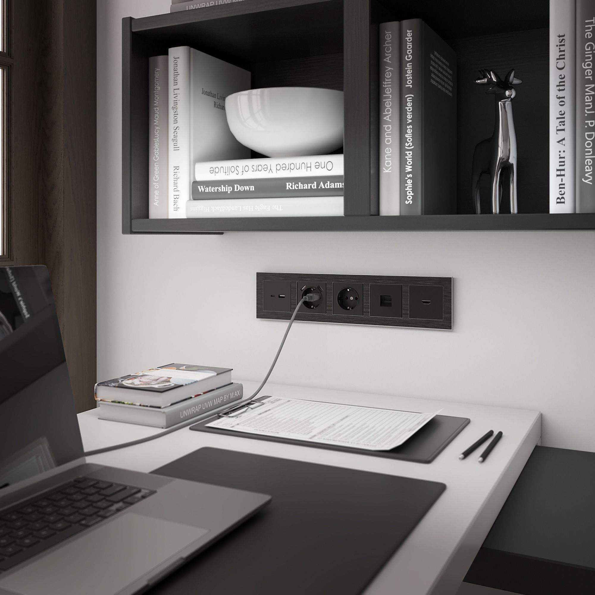 Механизм монтируется в установочную коробку, оставляя видимым только внешнюю лицевую панель и декоративную рамку. Компьютерная розетка для скрытой установки оснащена суппортом из нержавеющей стали и распорными лапками, позволяющие крепко зафиксировать изделие в подрозетнике.