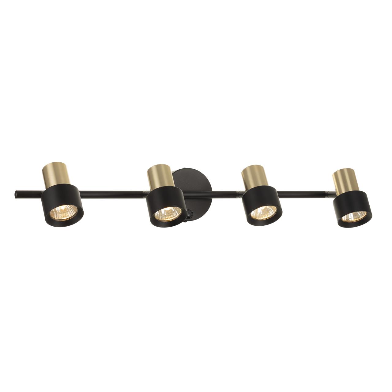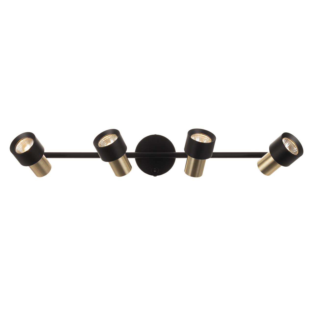 Стильный настенный светильник Citilux SAT CL505641 станет прекрасным дополнением вашего интерьера. Корпус металлический, строгого чёрного цвета с благородным золотым матовым декором. Основание круглой формы с удобным выключателем, на штанге расположены четыре поворотных плафона.