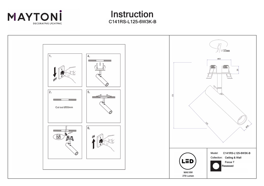 Спот светодиодный встраиваемый Maytoni Focus T C141RS-L125-6W3K-B — это надёжный и долговечный осветительный прибор, который прослужит вам долгие годы, не теряя своей яркости и качества света.