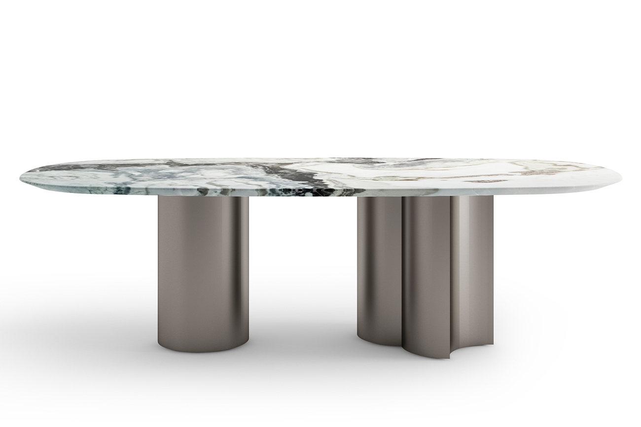 Обеденный стол с мраморной столешницей выглядит фундаментально и массивно за счет основания в виде колонн из нержавеющей стали. Такое стилистическое решение добавляет мебели не только устойчивости и надежности в эксплуатации, но и подчеркивает ее индивиду...