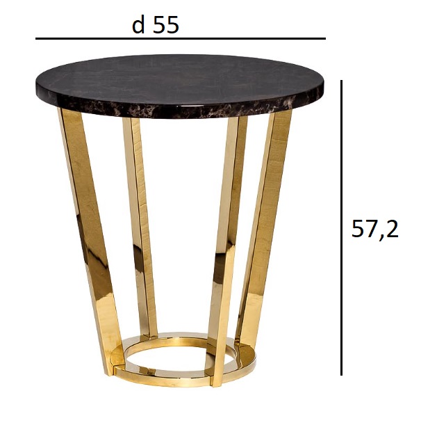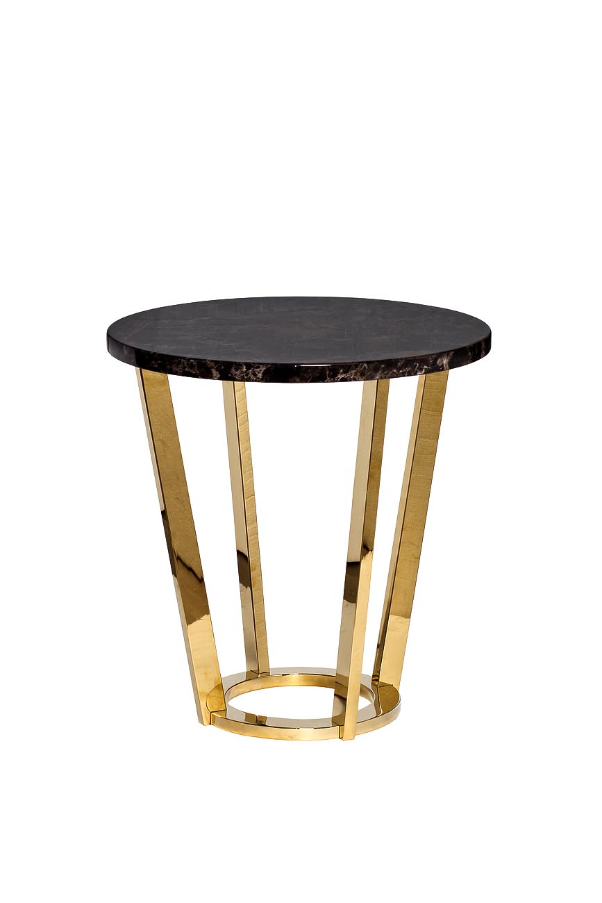 Элегантный журнальный столик 33FS-ET20C05-PG Dark Emperador со столешницей из МДФ с принтом под мрамор глубокого коричневого цвета с прожилками украсит холл, прихожую или гостиную. Основание из нержавеющей стали блестящего золотого цвета придает столику р...