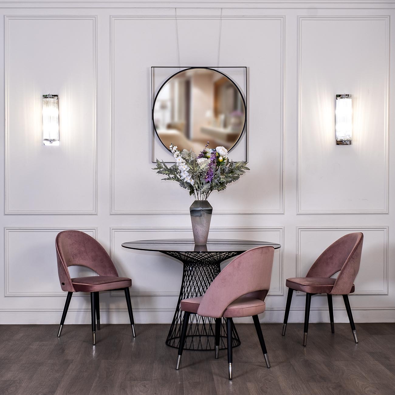 Один из важных элементов, к выбору которого необходимо подойти серьезно – это стул для столовой. Такая мебельная конструкция сама по себе должна быть удобной, практичной и стильной. Если в интерьере столовой преобладает нежные и светлые оттенки, можно рассмотреть вариант покупки пепельно-розового стула с черными ножками. При этом он выглядит благородно. Такой велюровый стул с закругленной спинкой отлично подойдет всем любителям роскоши. Дизайнерский обеденный стул заслуживает быть в столовой ценителя стиля и искусного исполнения мебели. Сиденье: ширина 47, глубина 48, высота 47см