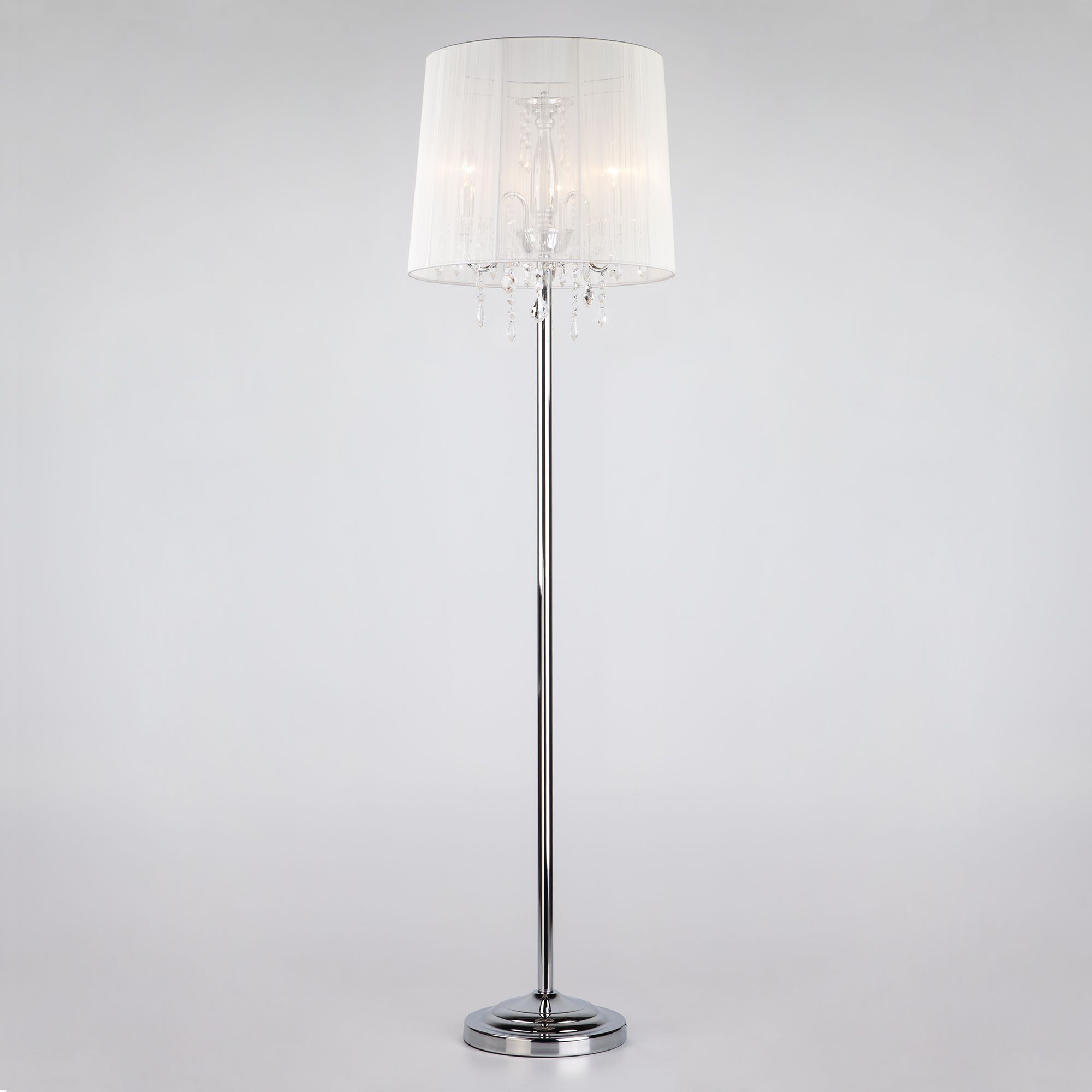 Торшер с прозрачным абажуром 2045/3F хром/белый - это стильный элемент светового дизайна в современных и классических интерьерах. Выразительный и современный торшер со сменными лампами E14 поможет создать качественное дополнительное освещение на площади 10 м² и станет изящным украшением вашей комнаты.
