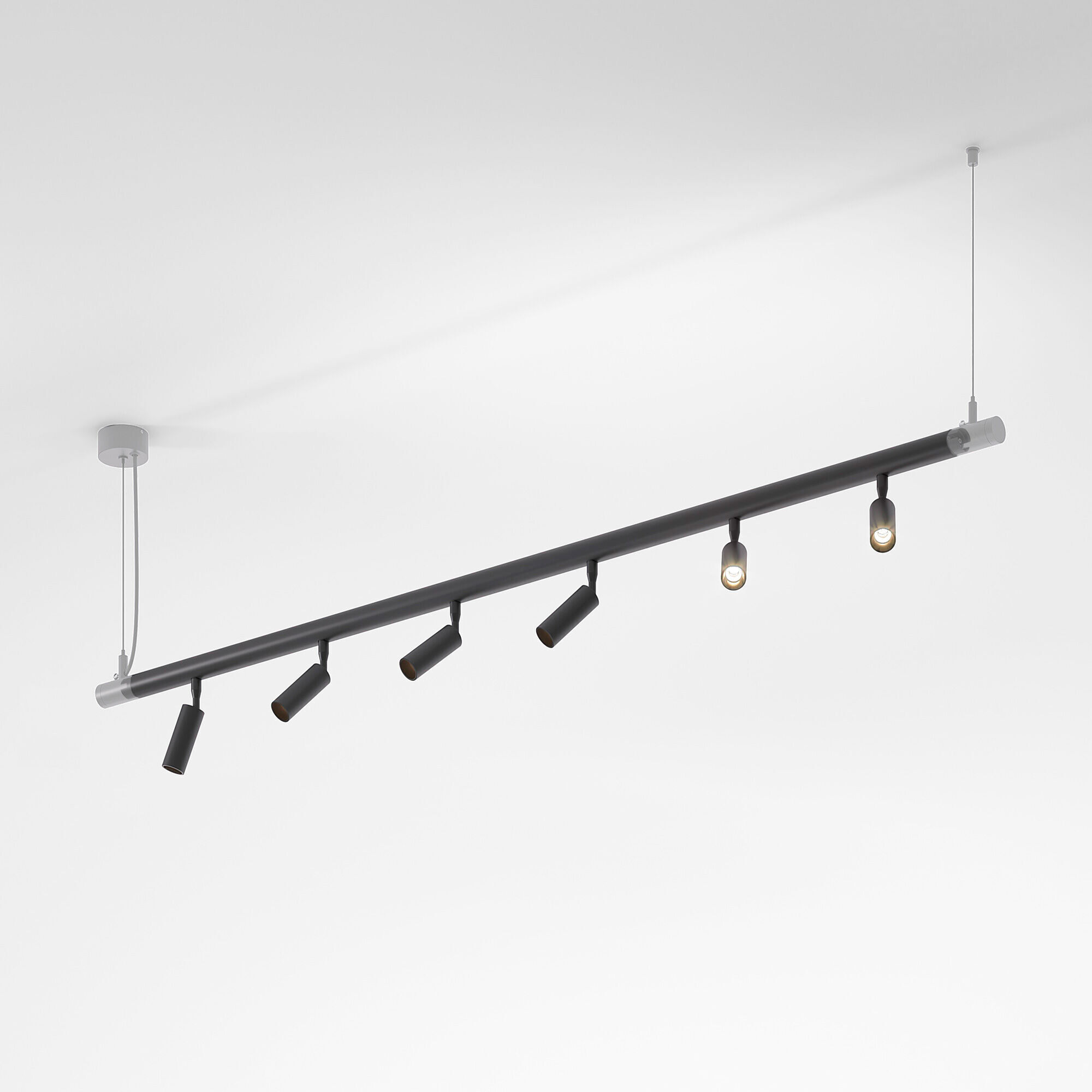 Для установки системы требуются трековые светильники и комплектующие (трансформатор, гибкие стойки, набор для подвеса).