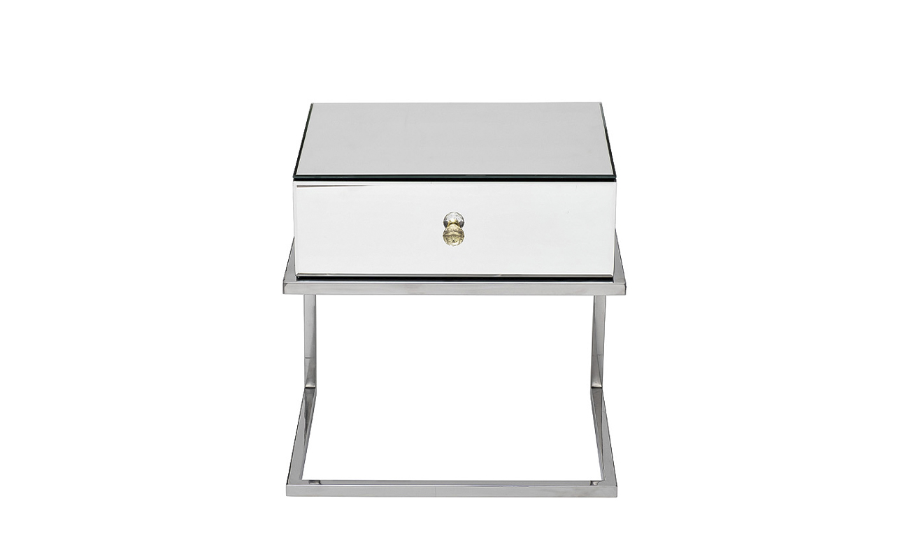 Оригинальная тумбочка на металлическом каркасе привлекает внимание необычной формой – вместо традиционных ножек здесь стальная рама с хромированным блеском. Выглядит такая конструкция весьма интересно и современно. Если ищите нестандартную мебель для спальни в современной стилистике, зеркальная тумбочка станет отличным выбором. Визуально легкая, эффектная, практичная и устойчивая, она украсит собой пространство не только спальни, но и прихожей, коридора, холла.