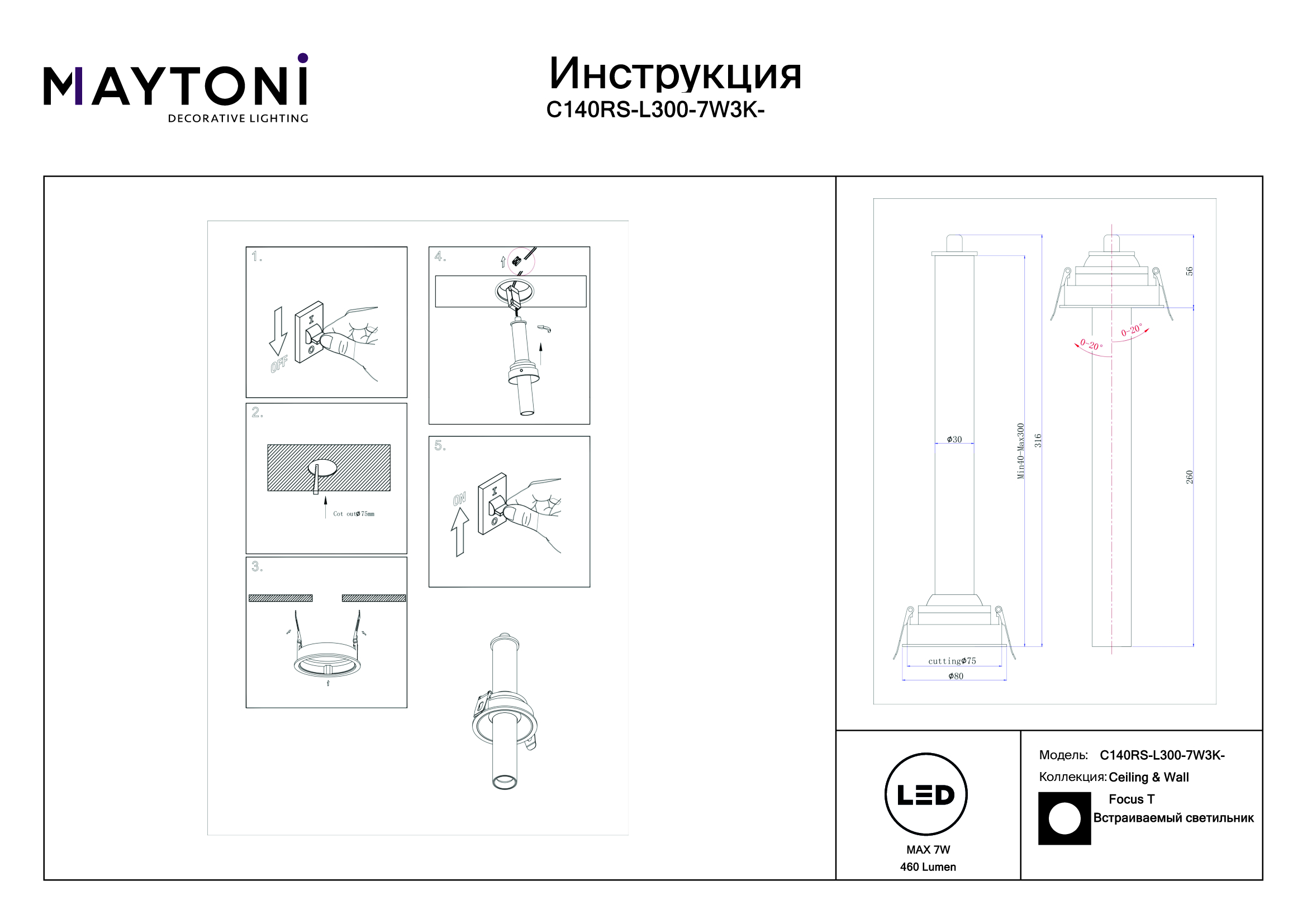 Встраиваемый светодиодный светильник Maytoni Focus T C140RS-L300-7W3K-BBS — это модель, которая воплощает гармонию формы и функции. Благодаря источнику света с типом цоколя LED и мощностью 7 Вт, а также цветовой температуре 3000 К, этот осветительный прибор обеспечивает комфортное и равномерное освещение на площади в 1 квадратный метр, создавая уютную атмосферу в вашем доме. Световой поток равен 460 Лм.